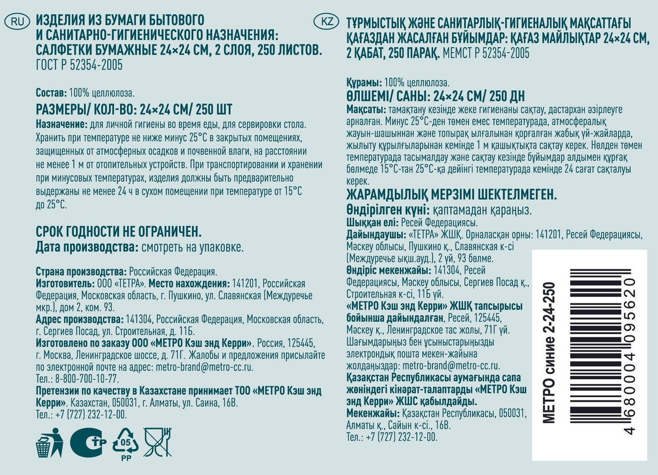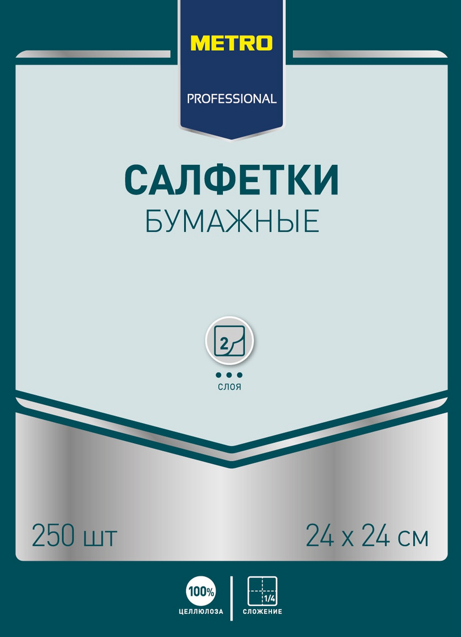 METRO PROFESSIONAL Салфетки бумажные двуслойные синие 250шт, 24x24см
