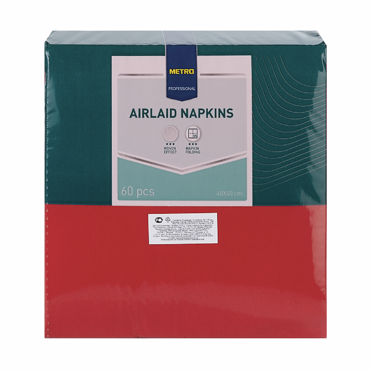 METRO PROFESSIONAL Салфетки красные, 40см - практичные целлюлозные изделия для бытовых и гигиенических целей, которые стали хорошим аналогом для салфеток из тканевого сырья. Это одноразовые салфетки салатового однотонного цвета и большого размера - 40 см на 40 см. Они являются прекрасным дополнением в сервировке стола, а их плотности достаточно для того, чтобы собрать жидкость или избавиться от жира и на поверхности рук, в том числе. В упаковке представлено 60 шт салфеток, сроки хранения которых не ограничены, при 100% отсутствии влажности.