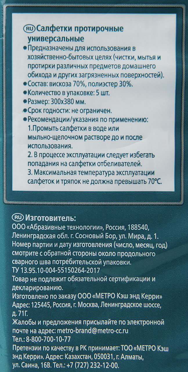 METRO PROFESSIONAL Салфетки протирочные с перфорацией 380x300 мм, 5 шт. сделаны из нетканого материала, приятного на ощупь. Его отличает плотная гладкая структура, которая не оставляет после себя ниточек и ворсинок, разводов, не царапает поверхности. Салфетки отлично впитывают влагу, остаются прочными на разрыв в мокром состоянии и быстро сохнут. Они идеально подходят для очищения кухни, ванны, туалета, офисной техники и мебели, кузова автомобиля. С помощью изделия можно быстро и тщательно очистить поверхность любого типа, в том числе зеркала, стекла, бокалы и чашки. Оно отлично используется в паре с любыми моющими и чистящими средствами. Салфетки подходят для полировки мебели. Они поставляются в виде небольших полотен ткани.