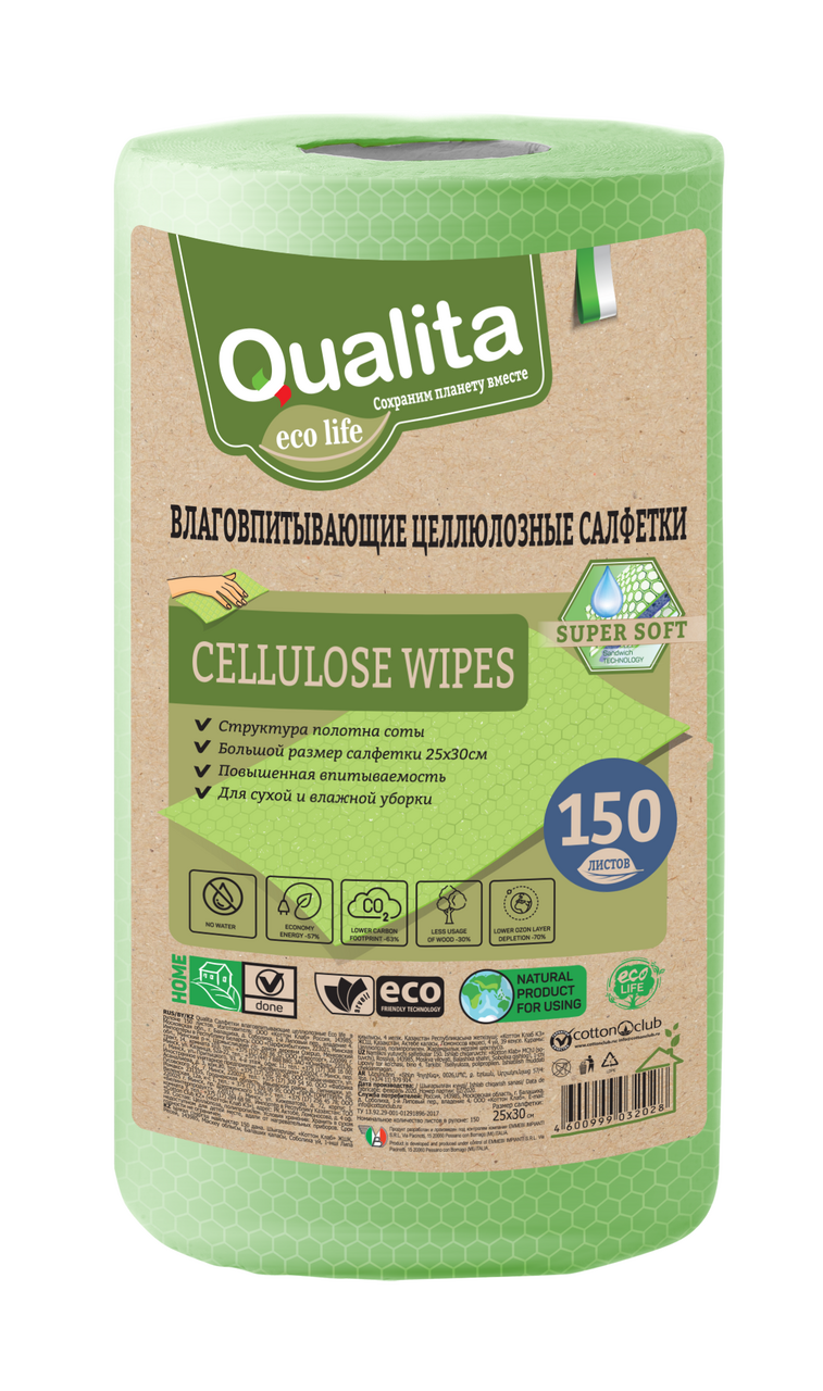 Целлюлозные салфетки в рулоне Eco Strong повышенной прочности предназначены для сухой и влажной уборки, будут незаменимы в офисе, квартире, дома и даже в машине. Отлично впитывают влагу. Легко отрываются. Благодаря сотовой структуре полотна не оставляют ворса и разводов. Можно использовать несколько раз. Разработаны по технологии eco friendly technology, при производстве полотна не использовалась вода, затрачивалось меньше энергии, количество выбросов Со2 на 63% меньше, чем при производствеве стандартного полотна. Количество листов в упаковке: 30 шт. Размер листа: 23,5x30 см Цвет: зеленый. QUALITA Ecolife с любовью заботится об экологии. Наша продукция производится из натуральных материалов, благодаря этому она безопасна и экологична.