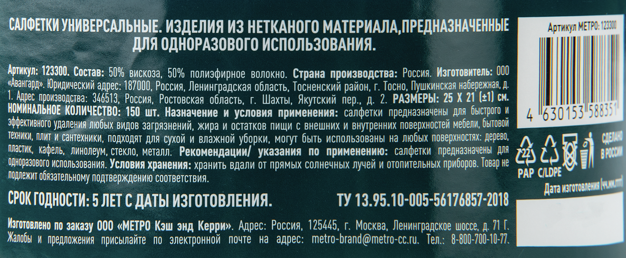 METRO PROFESSIONAL Салфетки в рулоне универсальные 25x21 см, 150 л – продукция из нетканого материала, который отличается безворсовой структурой и высокой влагопоглощающей способностью. Такие салфетки идеально подходят для кухни, ванны, туалета, офисной техники, автомобиля и многих других мест. С их помощью можно быстро и тщательно очистить поверхность любого типа, в том числе зеркала, стекла и люстры. При этом их можно использовать в паре с любыми моющими средствами. Такими салфетками можно даже отполировать мебель, предотвратив оседание на ней пыли. Немаловажно, что такие изделия не оставляют разводов и волокон. Поставляются в виде одного большого рулона, помещенного в плотную упаковку.
