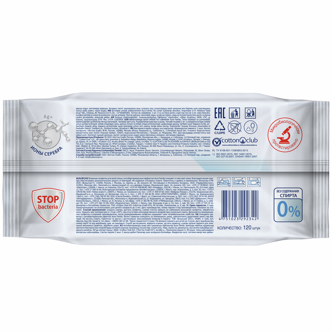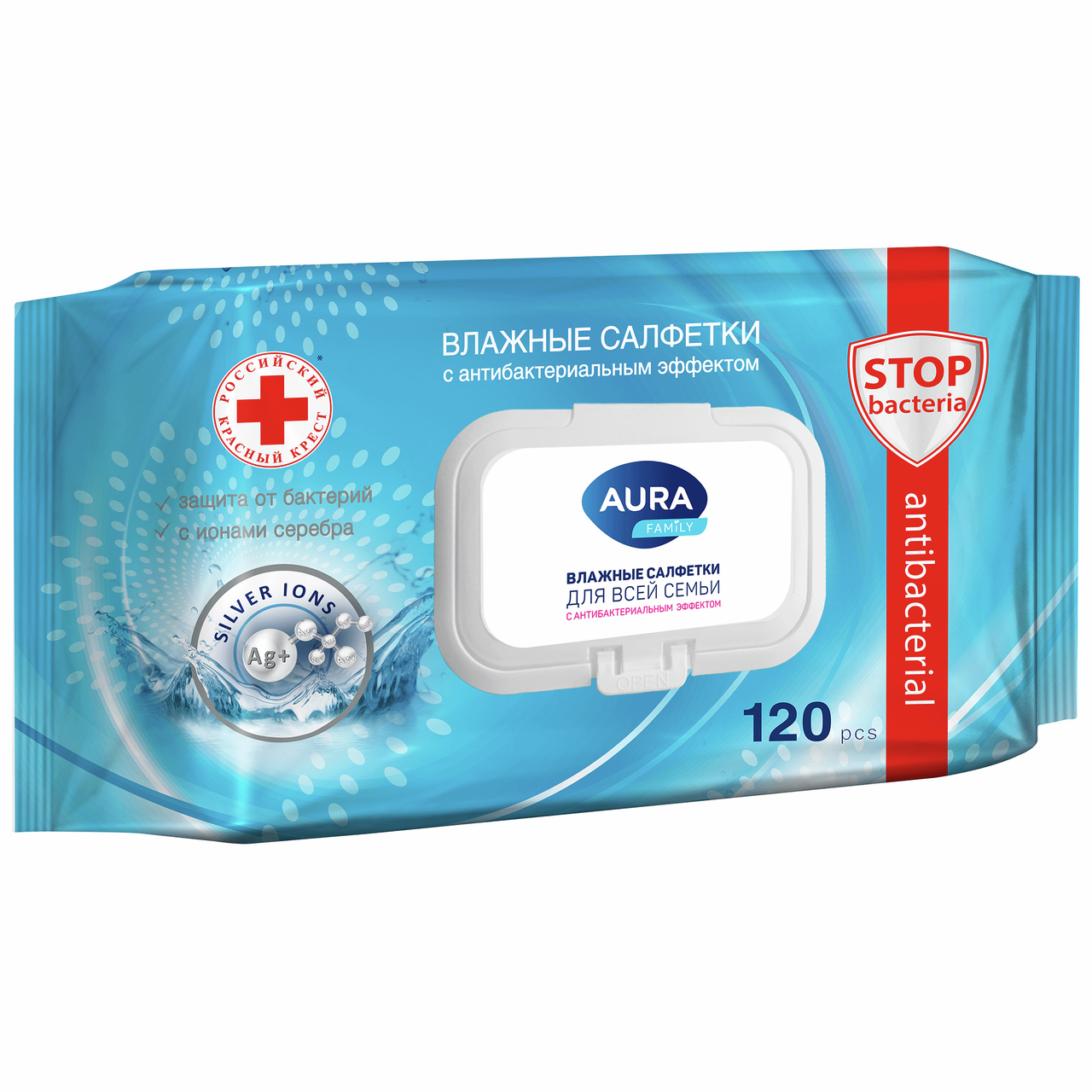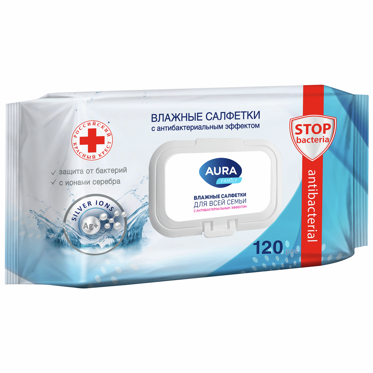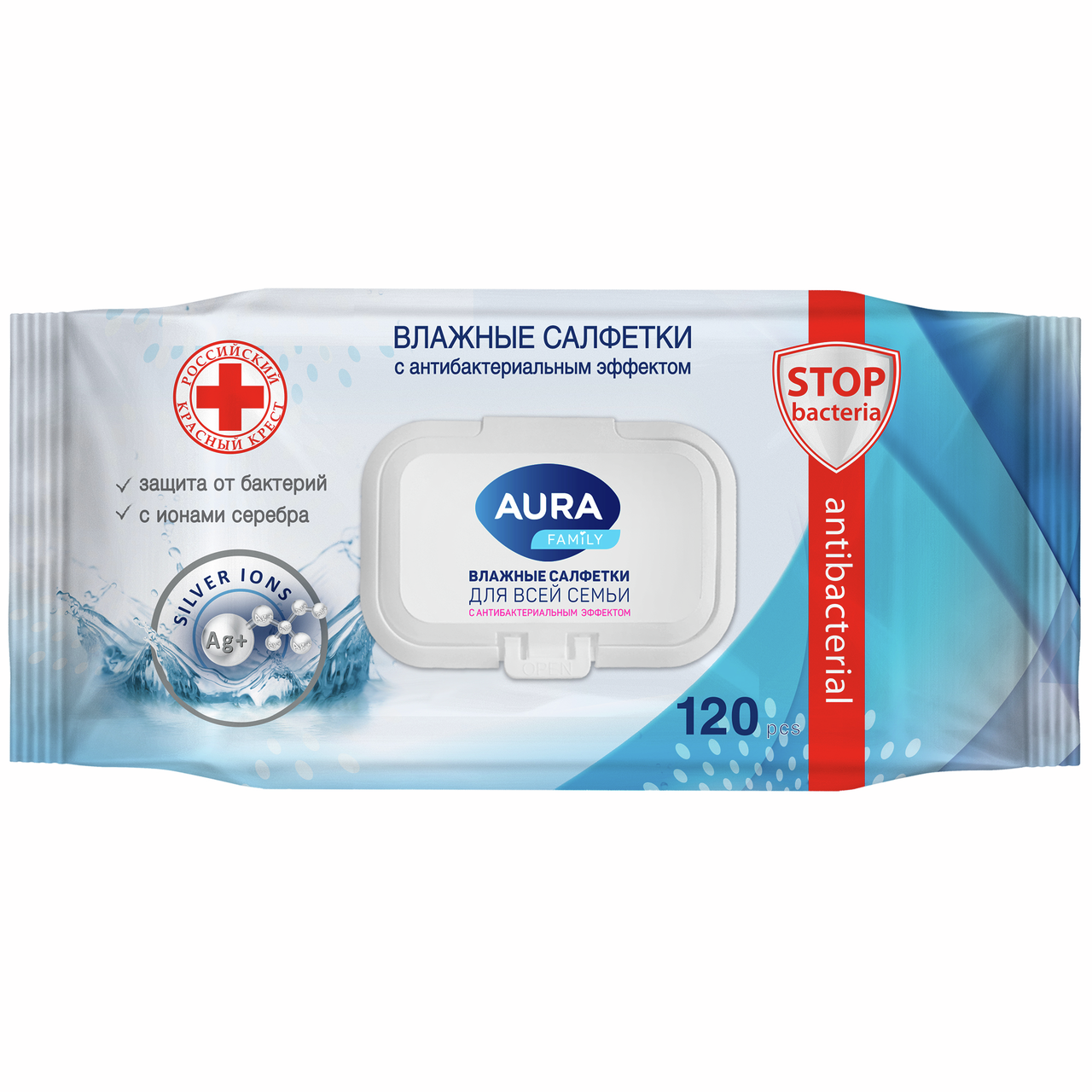 Салфетки влажные Aura Family с антибактериальным эффектом, 120шт