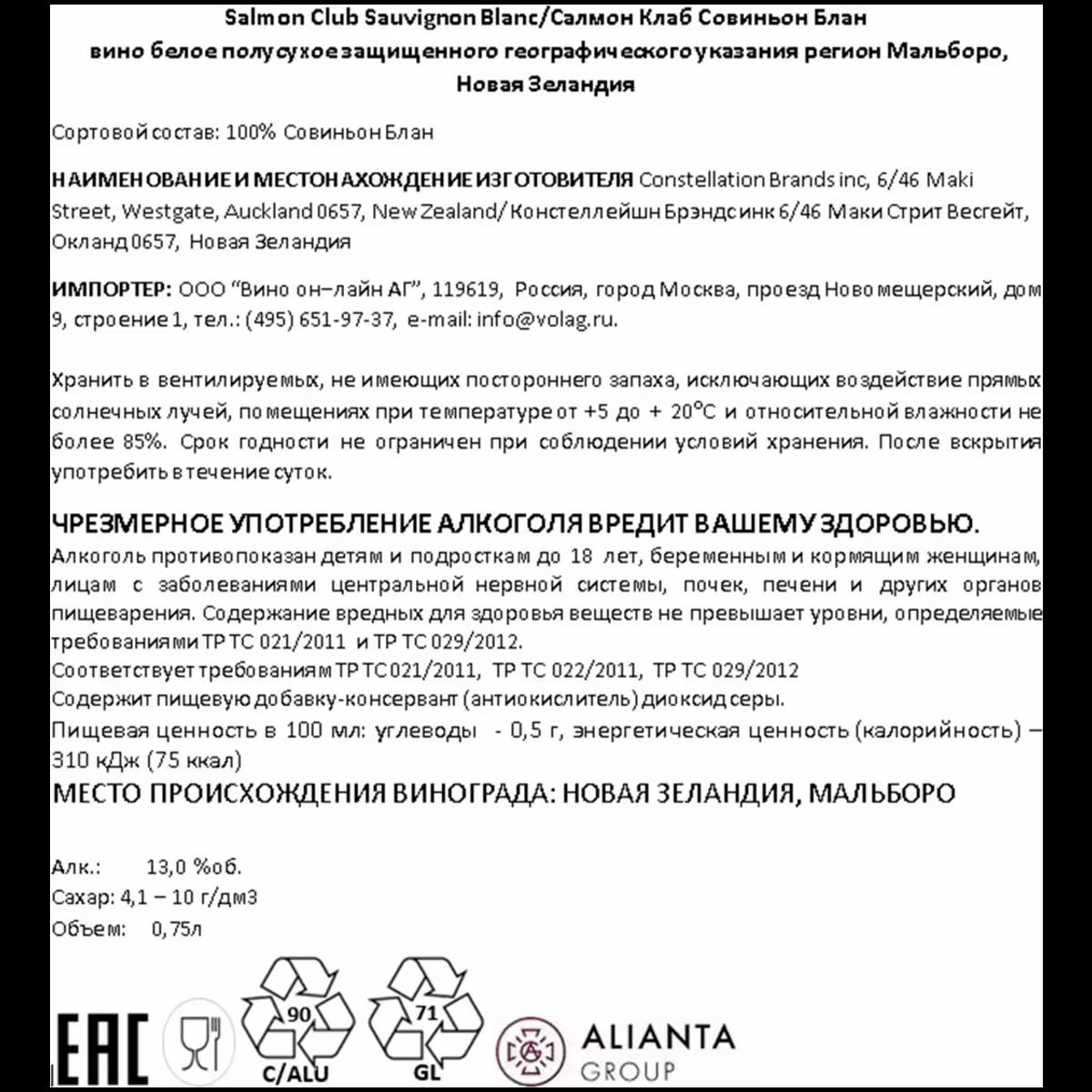 Вино Salmon Club Sauvignon Blanc белое полусухое, 0.75 л