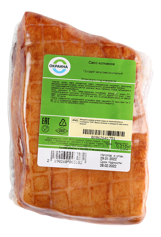 Секрет приготовления вкусного копченого Сала зависит от двух факторов: Первое – это качественное сырье: белоснежный шпик с мясной прирезью. Второе - выбор щепы для копчения, от которой зависит цвет готового продукта, аромат и самое главное – вкус. Для получения равномерного цвета и аромата продукта щепа должна быть сухой и одинаковой по размеру, а вот вкус формирует именно тип древесины, из которой изготовлена щепа. Бук – идеальный вариант для горячего копчения шпика и сала: копчение ложится равномерно по поверхности продукта, образуя насыщенный золотистый цвет, легкий аромат дымка и неповторимый вкус. Именно так мы готовим Сало копченое Окраина. Рекомендуется перед нарезанием шпик немного подморозить, нарезать тонкими слайсами и положить поверх свежего черного хлеба. Отличается нежной упругой текстурой, насыщенным вкусом и выразительным ароматом. Его можно подавать к столу в виде нарезки, использовать для приготовления канапе и бутербродов. Подчеркнуть дегустационные качества сала поможет ржаной хлеб, зеленый лук или укроп, горчица или хрен. Его можно подавать к отварному картофелю, использовать для яичницы. Употребление такого продукта не только разнообразит привычное меню, но и приносит пользу организму: укрепляет иммунитет, замедляет старение, активизирует метаболизм.