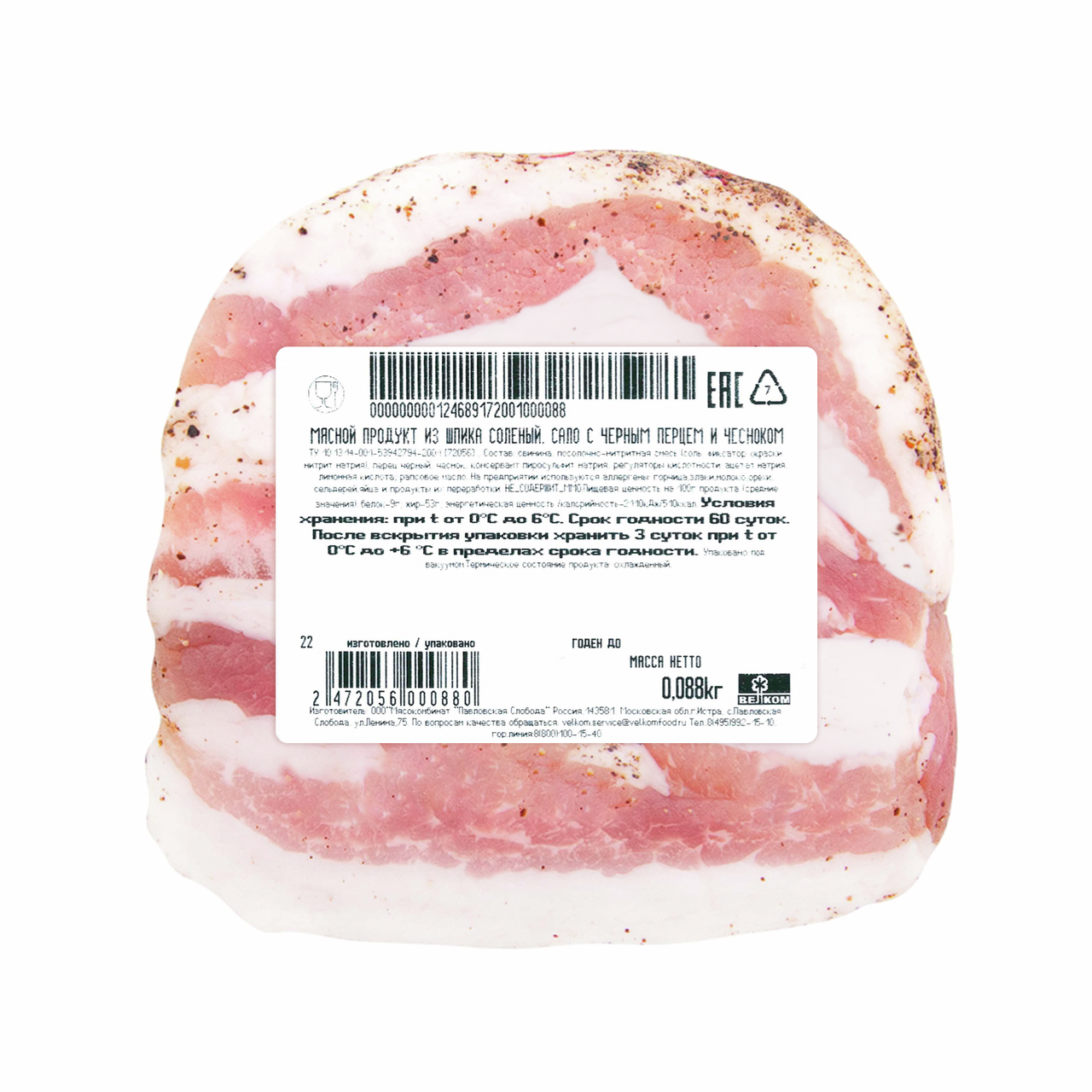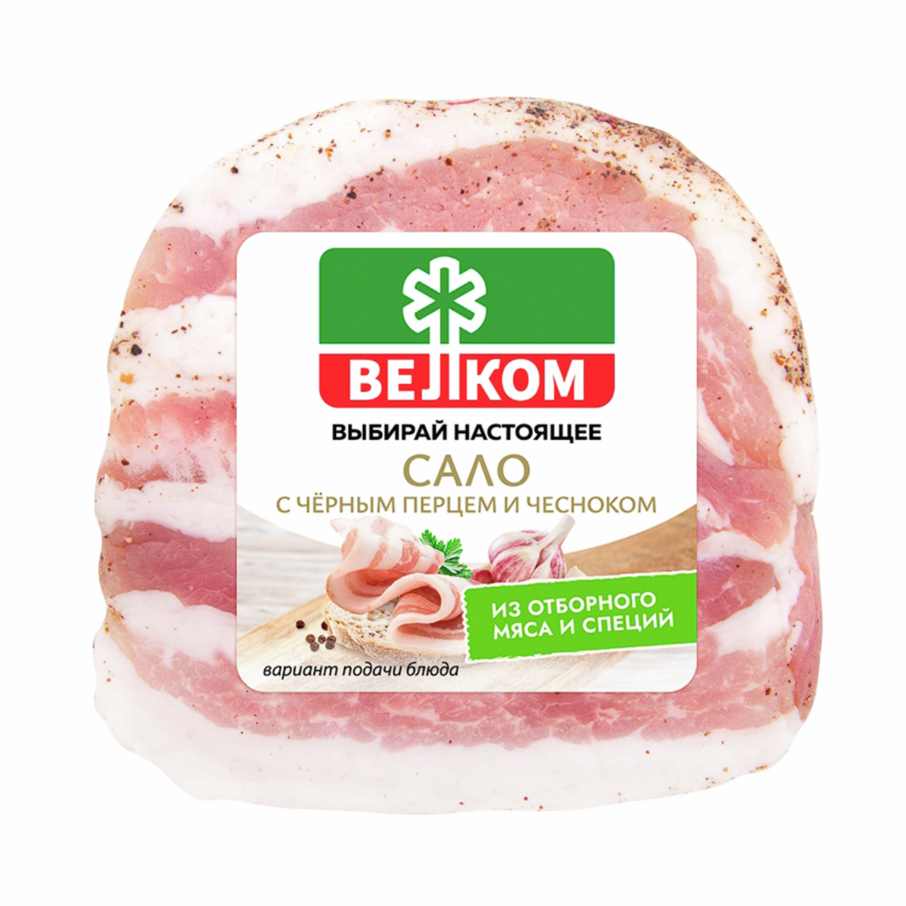 Сало с черным перцем и чесноком - это нежный шпик из отборного мяса в обсыпке из черного перца и чеснока. Сало идеально сочетается с черным хлебом, горчицей и свежей зеленью. Насыщенный аромат свежемолотого черного перца и пикантная острота чеснока - только натуральные ингредиенты.