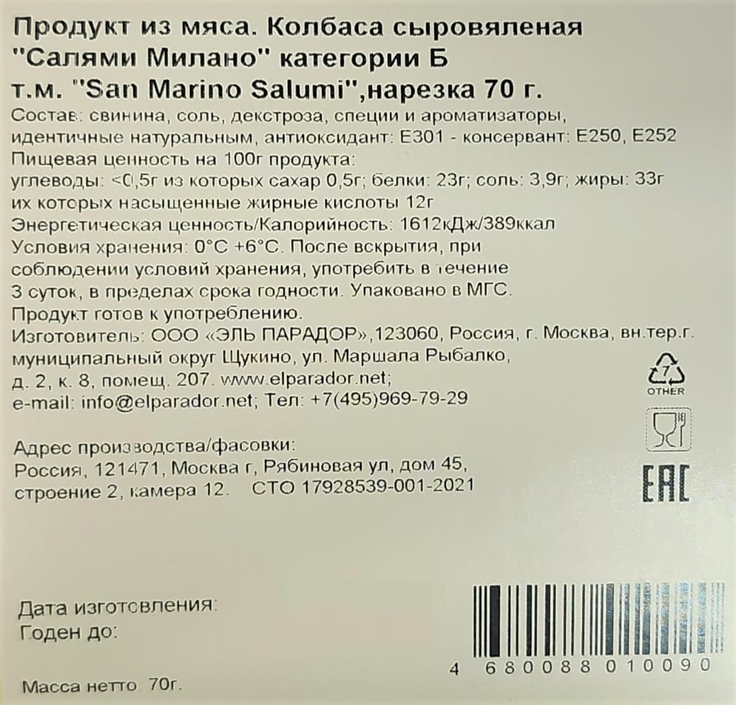 Колбаса сыровяленая салями Милано бренда San Marino станет отличным вариантом закуски на праздничный стол, а также ее можно использовать в качестве дополнения к супам и начинки для пиццы. Для изготовления салями используется отборная свинина, соль и ароматные специи, благодаря чему деликатес отличается приятным сладковатым привкусом и нежным мясным ароматом. Продукт в вакуумной упаковке порезан на тонкие ломтики для удобства употребления.