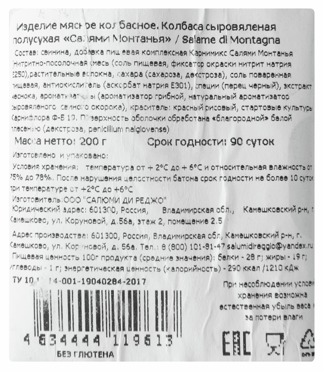 Колбаса сыровяленая полусухая Салями Монтанья - изготавливается по итальянской технологии под торговой маркой Salumu di Reggiо. Производство находится во Владимирской области в г. Камешково на территории Индустриального парка Камешково. Открытие производства осуществлялось при непосредственном участии команды профессионалов из Италии. Для её приготовления использовали только натуральное, свежее свиное мясо со свиным шпиком. Это ферментированный продукт, подвергнутый сушке, оболочка которого покрывается съедобными культурами грибка Пеницилла, что придает аромат и способствует сохранению свежести продукта. Колбаса отличается присущим ей ароматом сыровяленого свиного окорока с тонкой ноткой грибов и едва уловимым оттенком чеснока. Контрастность самой природы Италии диктует разнообразие и яркость вкусовых оттенков салями. Этот продукт широко используется в качестве самостоятельной закуски и является неотъемлемой частью некоторых видов пиццы, салатов и других блюд. Салями проходит длительный процесс вяления и обретает свой неповторимый вкус, который раскрывается даже при длительном хранении. А стаканчик красного вина и кусочек душистого сыра будут превосходным гармоничным дополнением к нашему фирменному продукту.