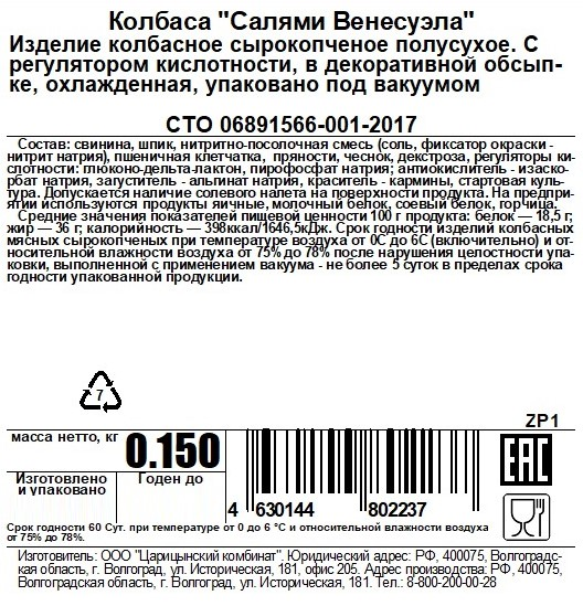Салями Царь-продукт Венесуэла сырокопченая, 150г