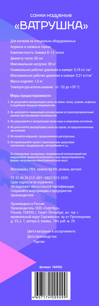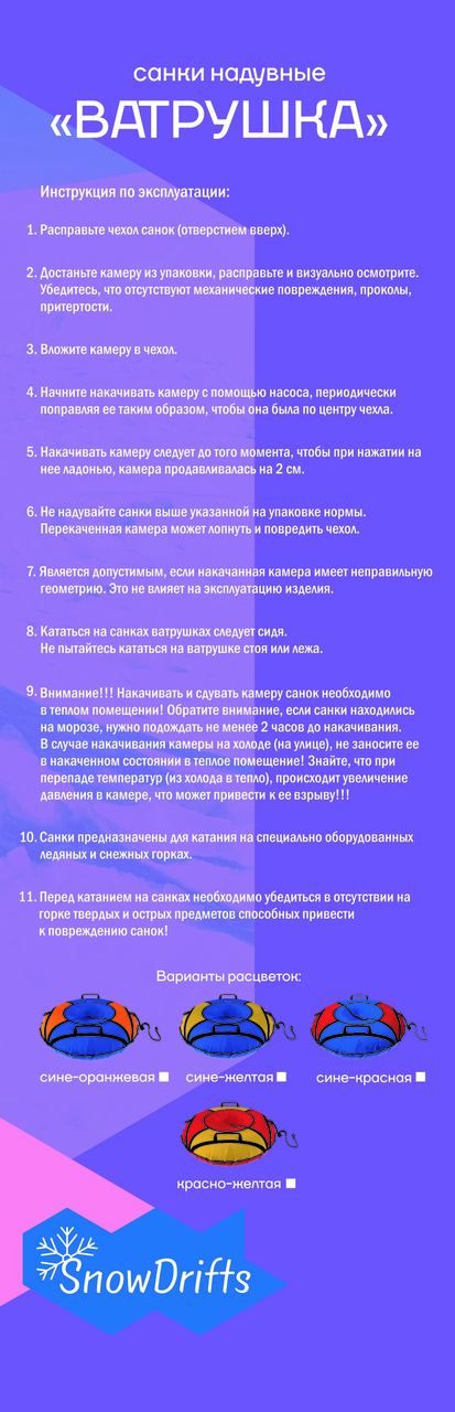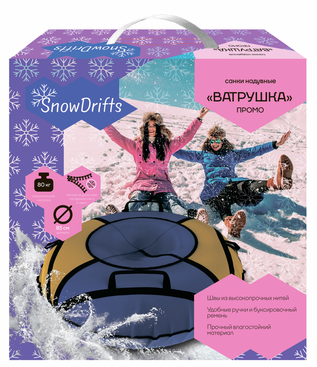 Санки надувные SnowDrifts ватрушка малые, 85 см станут отличной альтернативой привычным деревянным. Такой подарок непременно понравится детям. Во время прогулок они получат удовольствие от легкого скольжения. Такой активный отдых принесет несомненную пользу. Современный тюбинг удобно использовать. Он быстро надувается с помощью компрессора или насоса (не входит в комплектацию, приобретается отдельно). В сложенном состоянии занимает минимум места. Его удобно брать с собой на прогулки, за город, в лес. За несколько минут маленькое изделие превращается во вместительные сани и наоборот. С ними не будет проблем с транспортировкой. Материал, из которого изготовлена ватрушка, прочный и морозоустойчивый. Он легко скользит по горкам с минимальным количеством снега. Устойчив к механическому воздействию. Во время катания дети держатся за ручки. Эргономика изделия сводит риск падения к минимуму. В комплекте поставки есть буксировочный трос. Это позволяет кататься по ровной местности.