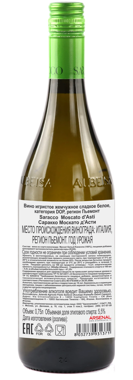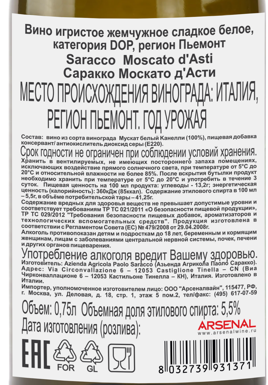 Вино Saracco Moscato d'Asti белое сладкое, 0.75л