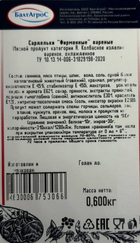Сардельки Балтагрос Фирменные вареные, 600г