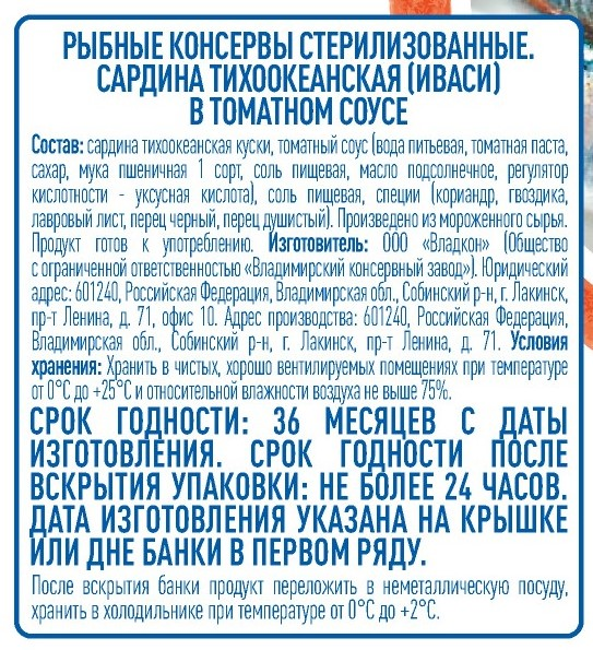 Сардина тихоокеанская куски, томатный соус (вода питьевая, томатная паста, сахар, мука пшеничная, соль пищевая, масло подсолнечное, регулятор кислотности - уксусная кислота), соль пищевая, специи (кориандр, гвоздика, лавровый лист, перец черный, перец душистый).