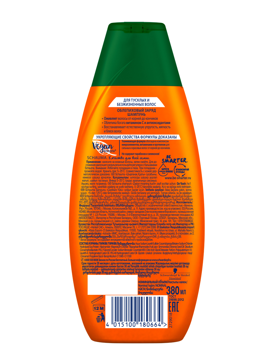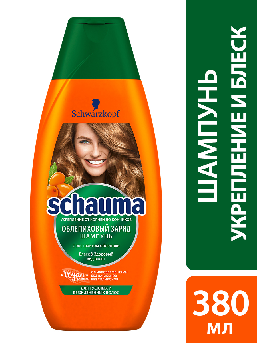 Шаума Шампунь Облепиховый заряд: Оживляет волосы от корней до кончиков Облепиха богата витамином С и антиоксидантами Восстанавливает естественную упругость, мягкость и блеск волос Ухаживающая формула обогащена комплексом микроэлементов, витаминами и протеином для сильных и красивых волос от корней до кончиков. Не содержит парабенов и силиконов!