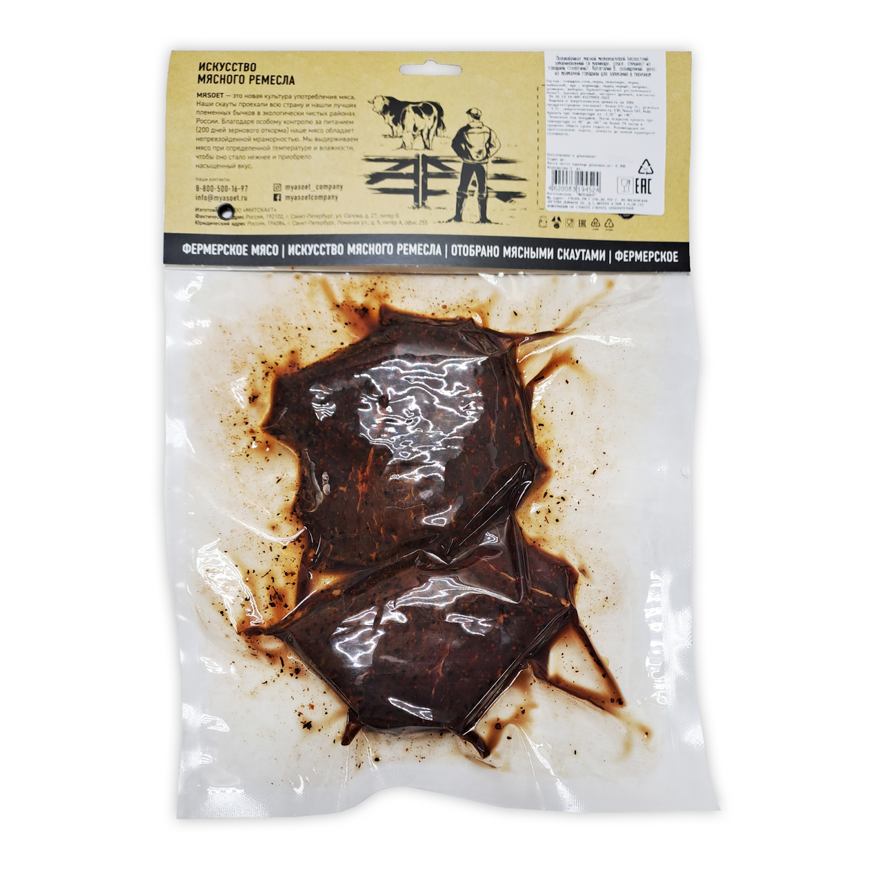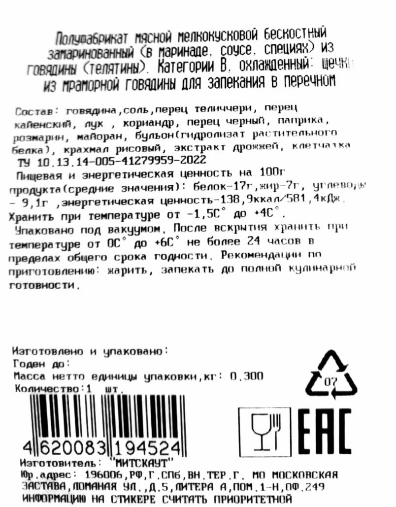 Щечки из мраморной говядины Myasoet Meat Company для запекания охлажденные, 300г представляют собой мясной отруб с тонкими коллагеновыми волокнами. Прожилки пронизывают мясо, придавая ему особую нежную текстуру. Говяжьи щеки универсальны. Их можно тушить, запекать, отваривать, жарить, томить, готовить в су-виде. Для щечек рекомендуется длительное температурное воздействие. Так нежное мясо будет разваливаться на волокна даже без помощи ножа. В качестве гарнира подойдет стручковая фасоль, рис, гречка, фунчоза и грибы. Дополнить вкус деликатеса поможет винный или сливочный соус, а также томатная паста. Говяжьи щеки содержат большую долю белка, аминокислоты, коллаген и микроэлементы. Употребление субпродукта благотворно влияет на состояние волос и кожи, работу нервной системы и сердца, способствует укреплению костной ткани. Натуральный маринад без Е добавок и красителей размягчает волокна , что сокращает процесс готовки, а так же дополняет щёчки неповторимым вкусом. Идеально подходит для любителей блюд поострее.