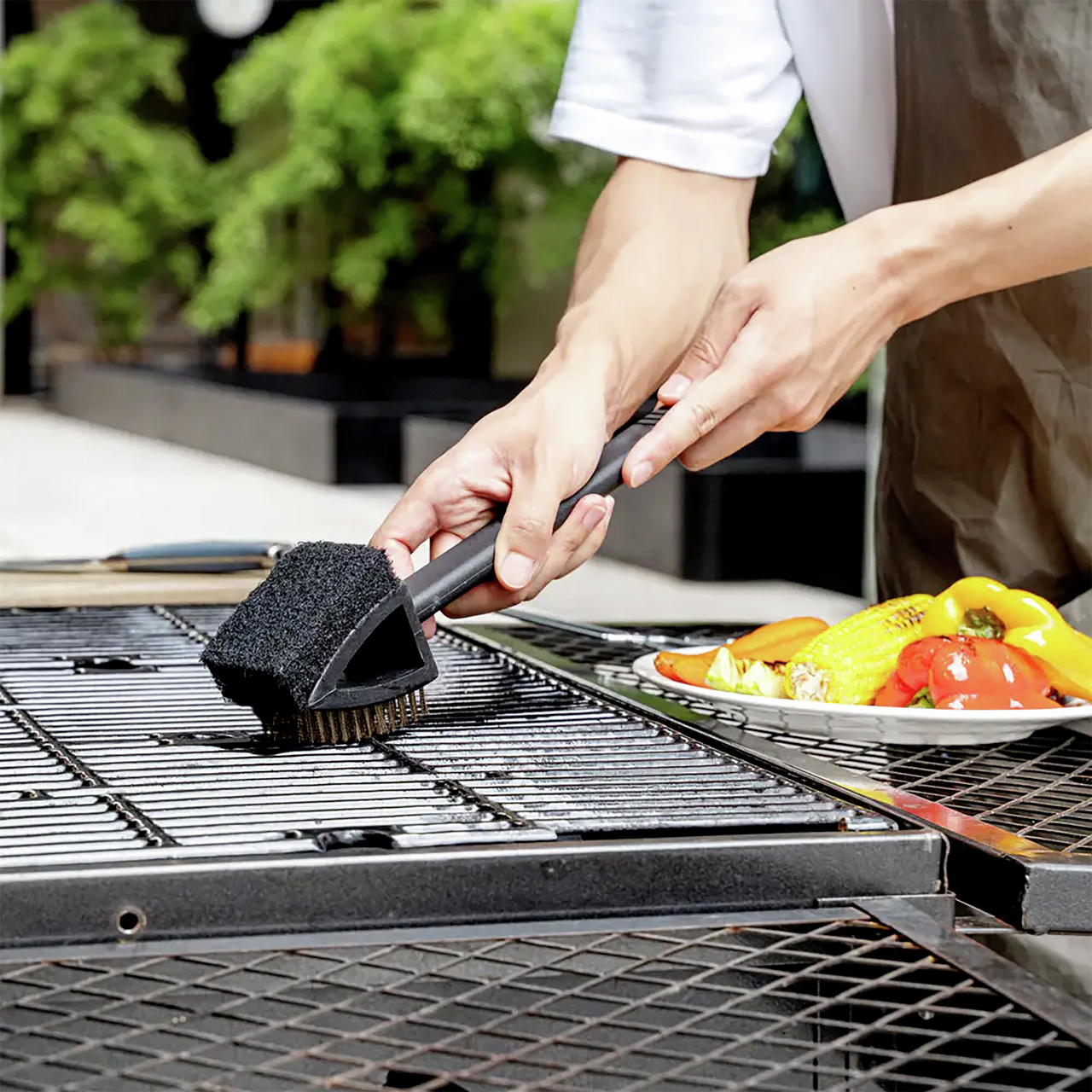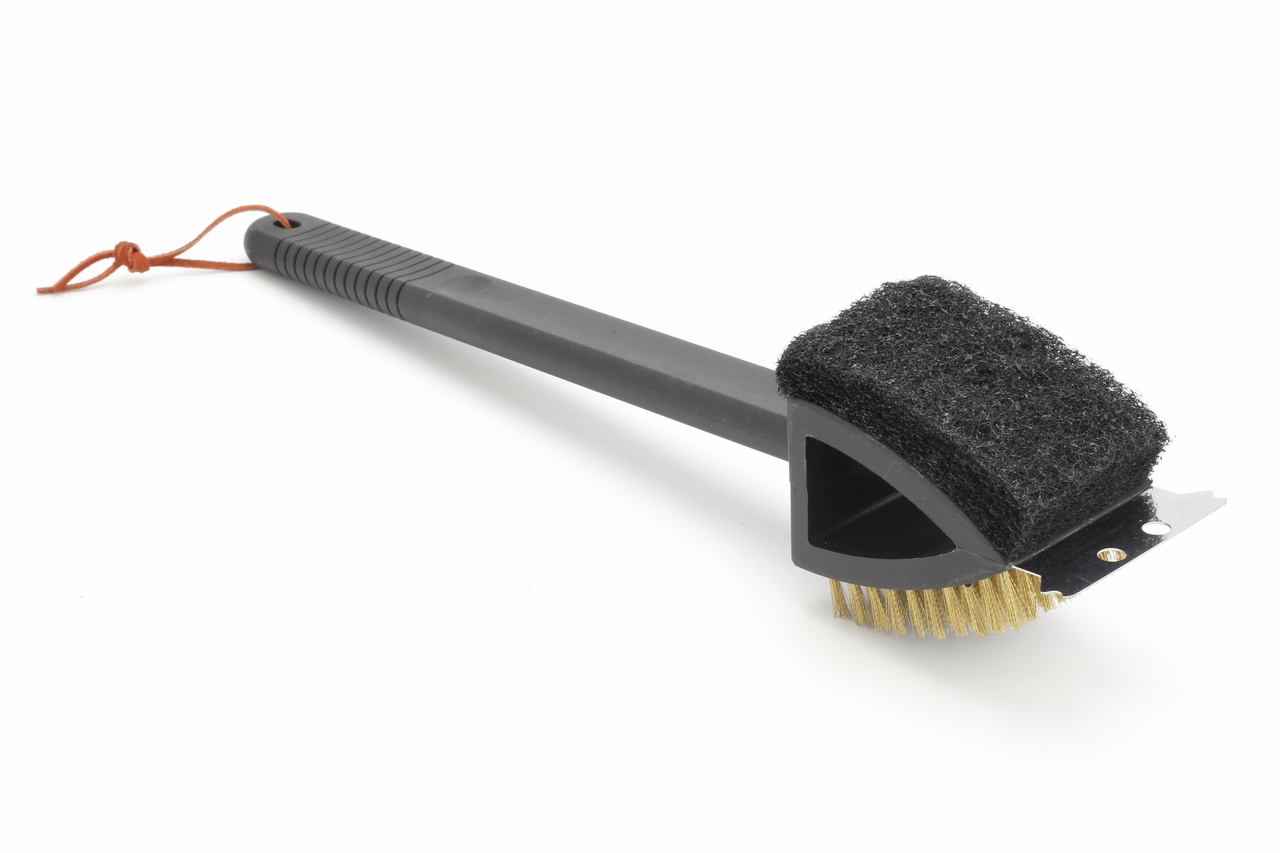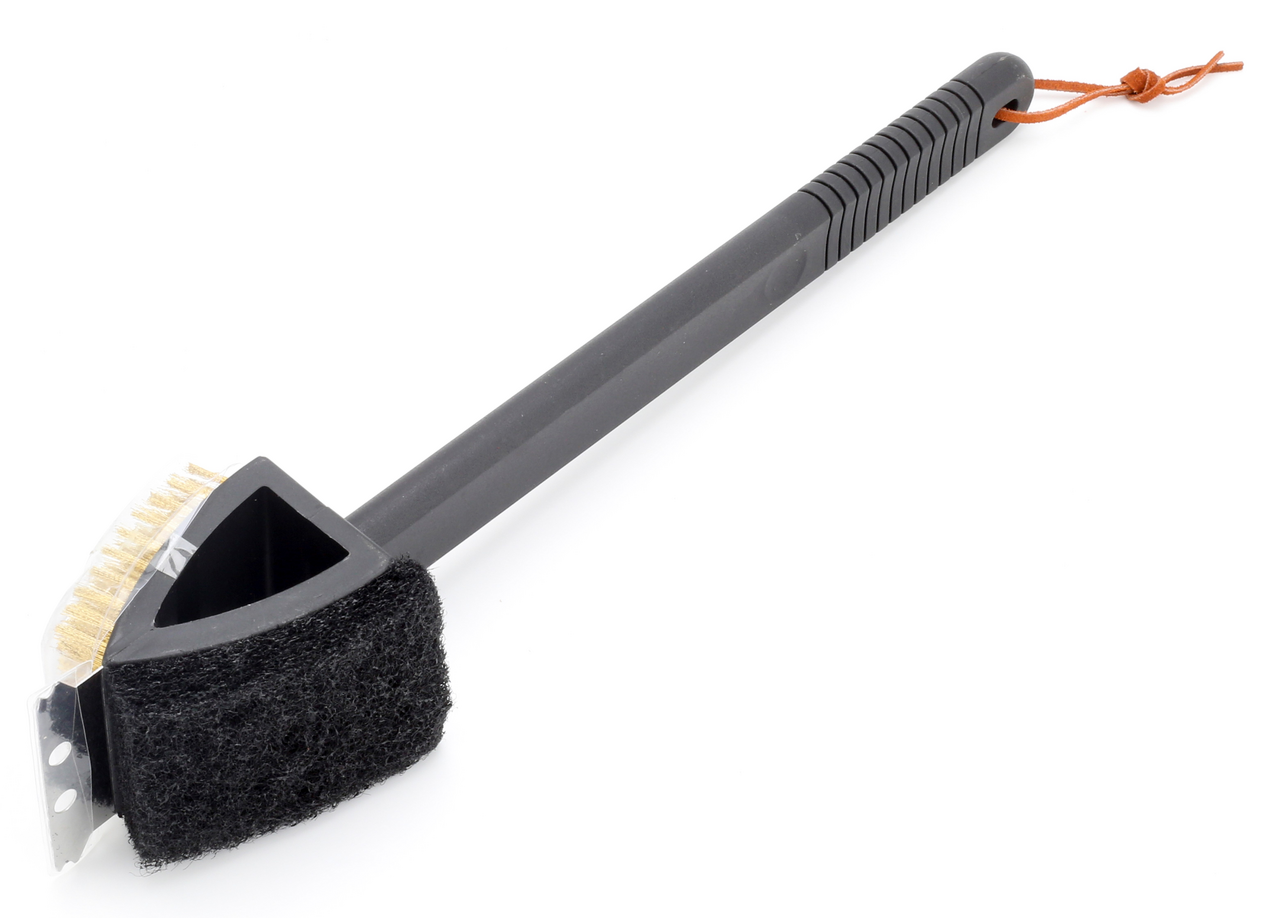 Состоит из трех частей: щетка с губкой для легкой очистки пыли и сажи, щетки средней жесткости для более интенсивной очистки гриля, и скребка, который с легкостью справится с въевшимися жиром и грязью. Используется для чистки грилей, барбекю, мангалов. Удобное и эргономичное сочетание различных частящих поверхностей.