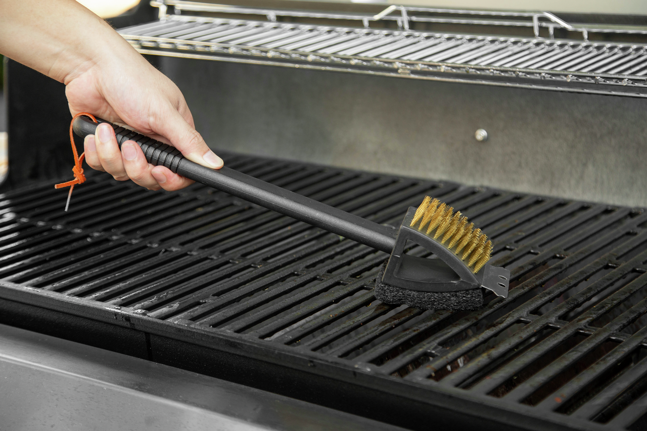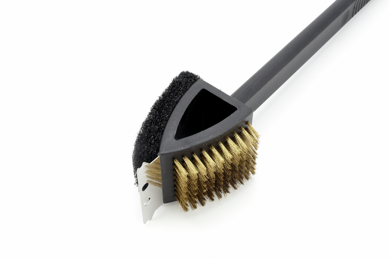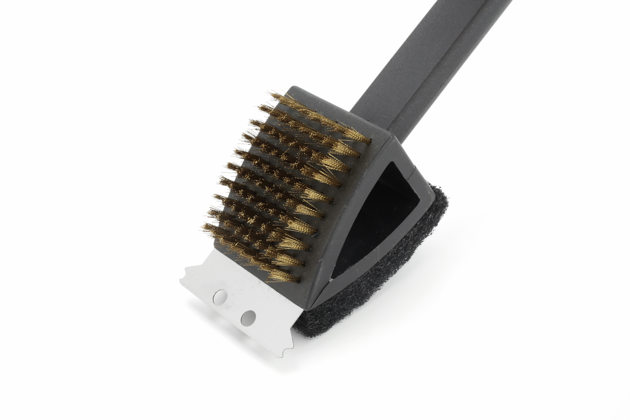 Состоит из трех частей: щетка с губкой для легкой очистки пыли и сажи, щетки средней жесткости для более интенсивной очистки гриля, и скребка, который с легкостью справится с въевшимися жиром и грязью. Используется для чистки грилей, барбекю, мангалов. Удобное и эргономичное сочетание различных частящих поверхностей.