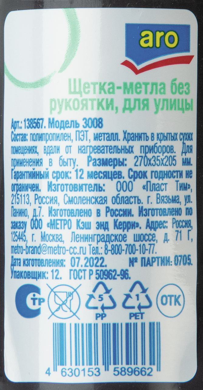 aro Щетка-метла для улицы без рукоятки, 27 х 3.5 х 20.5см