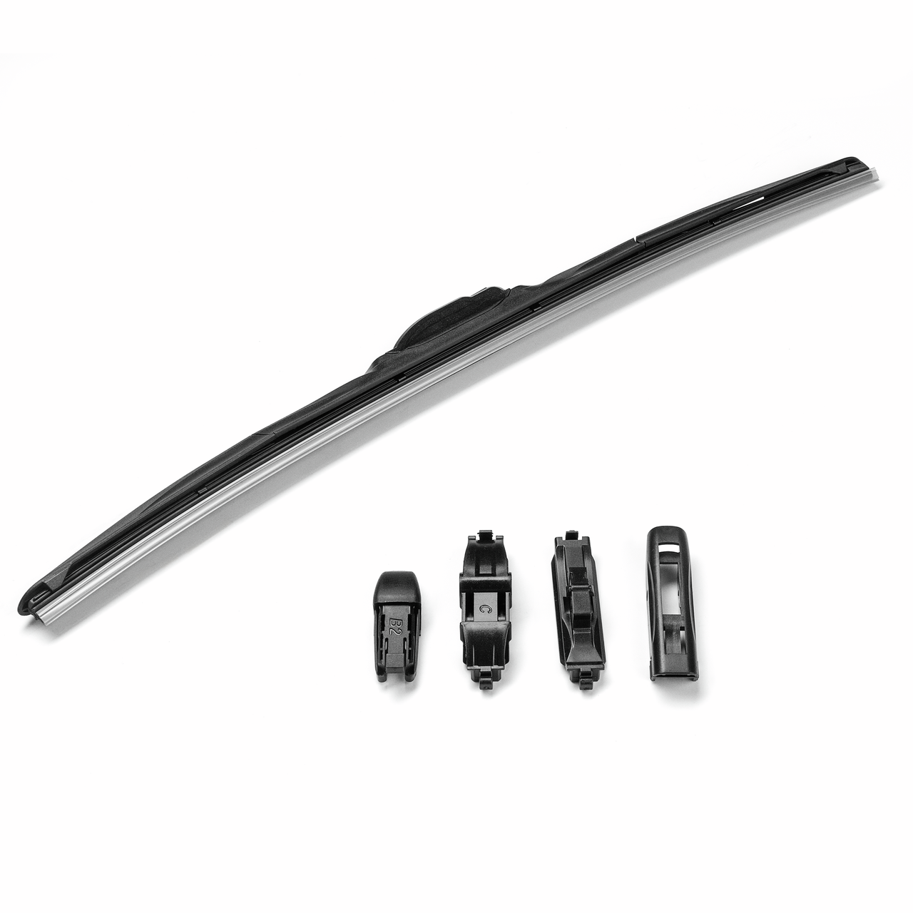 Щётки стеклоочистителей бескаркасные. Представляет собой пластиковый литой корпус, резиновое лезвие и металлические пластины внутри. Адаптеры из пластика. Резиновое лезвие в защитном пластиковом кожухе. Щётки и адаптеры чёрного цвета. Защитный кожух синий.