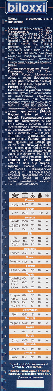 Щетка стеклоочистителя Biloxxi каркасная 22, 550мм прочная и износостойкая. В основе конструкции щетки лежит высокотехнологичная технология где чистящее лезвие лобового стекла посредством коромысел прикреплена к металлическому каркасу. Чистящее лезвие оставаясь при этом довольно подвижным, что и обеспечивает ему плотное прилегание к изогнутому лобовому стеклу. Рабочая поверхность лезвия выполнена из натурального каучука, который сохраняет отличные эксплуатационные качества как на морозе, так и в жару, не скрипит и не оставляет на стекле царапин. Щётки стеклоочистителей Biloxxi рассчитаны минимум на 350 000 рабочих циклов. Щётки укомплектованы адаптерами: подходят для 4-х типов креплений (U-hook, Bayonet, Push Button 16 mm, Side Pin 22mm). Универсальная конструкция позволяет применять щётки как для праворульных, так и для леворульных авто.