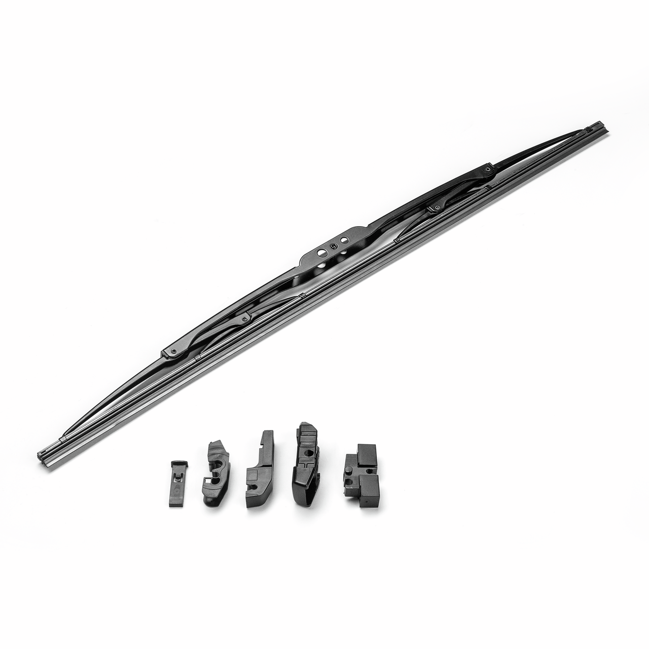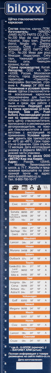 Щетка стеклоочистителя Biloxxi каркасная 24, 600мм прочная и износостойкая. В основе конструкции щетки лежит высокотехнологичная технология где чистящее лезвие лобового стекла посредством коромысел прикреплена к металлическому каркасу. Чистящее лезвие оставаясь при этом довольно подвижным, что и обеспечивает ему плотное прилегание к изогнутому лобовому стеклу. Рабочая поверхность лезвия выполнена из натурал��ного каучука, который сохраняет отличные эксплуатационные качества как на морозе, так и в жару, не скрипит и не оставляет на стекле царапин. Щётки стеклоочистителей Biloxxi рассчитаны минимум на 350 000 рабочих циклов. Щётки укомплектованы адаптерами: подходят для 4-х типов креплений (U-hook, Bayonet, Push Button 16 mm, Side Pin 22mm). Универсальная конструкция позволяет применять щётки как для праворульных, так и для леворульных авто.