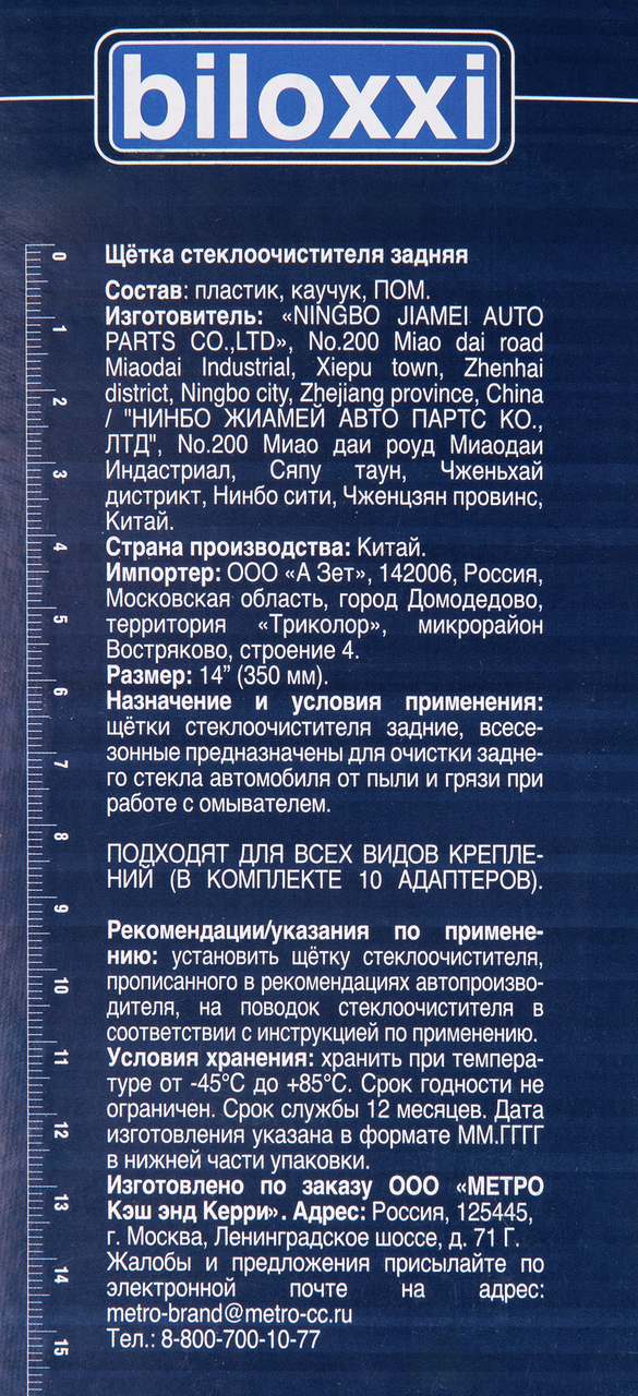 Задняя щетка прочная и износостойкая. Задние щетки сочетают в себе конструкции каркасных и бескаркасных щеток стеклоочистителя. Они отличаются очень маленькой высотой каркаса. Такие дворники имеют закрывающийся каркас с коромыслами, обеспечивающими отличное прилегание щетки к стеклу. Чистящее лезвие оставаясь при этом довольно подвижным, что и обеспечивает ему плотное прилегание к изогнутому лобовому стеклу. Рабочая поверхность лезвия выполнена из натурального каучука, который сохраняет отличные эксплуатационные качества как на морозе, так и в жару, не скрипит и не оставляет на стекле царапин. Щётки стеклоочистителей Biloxxi рассчитаны минимум на 350 000 рабочих циклов. Щётки укомплектованы 10-ти адаптерами и подходят ко всем без исключения креплениям автомобилей.
