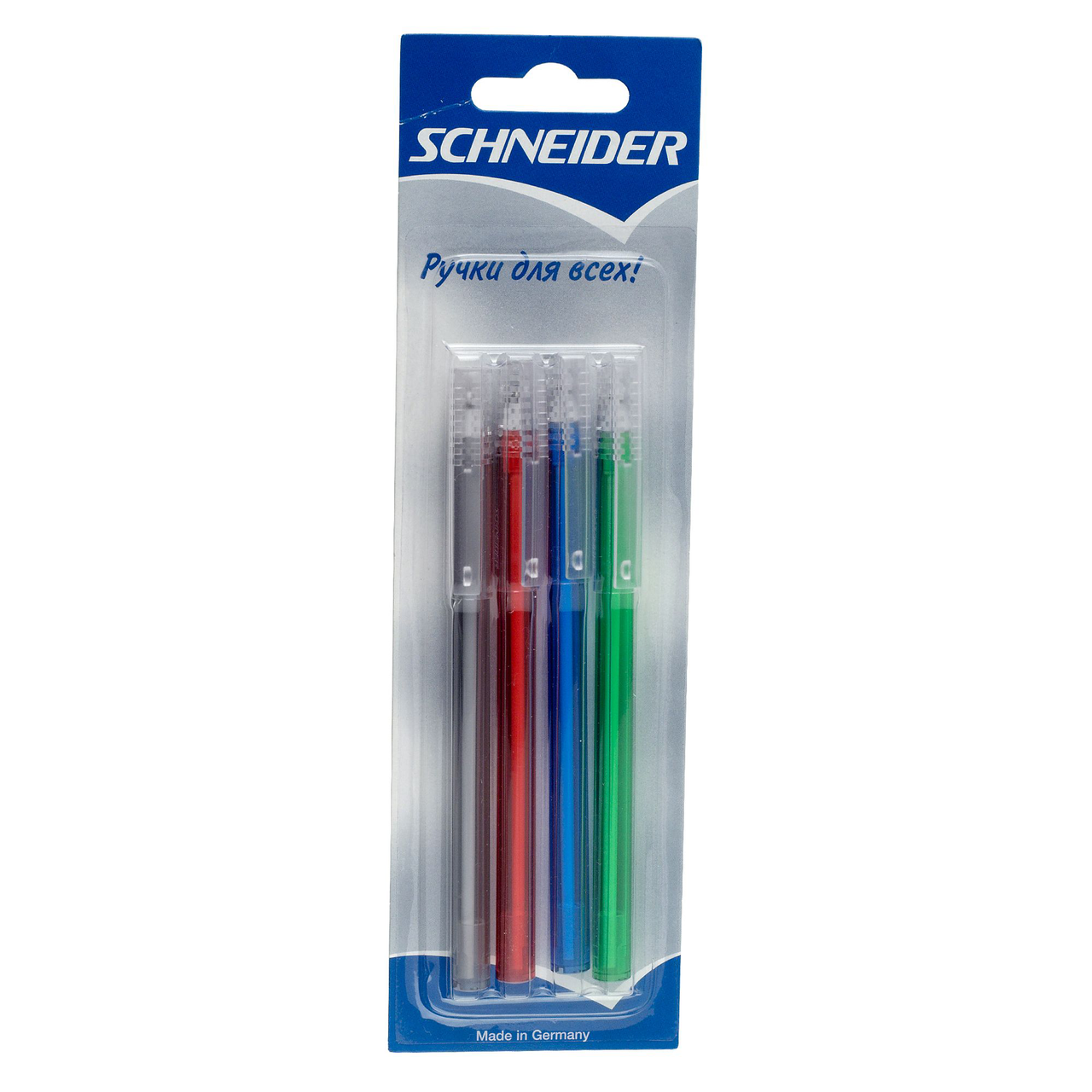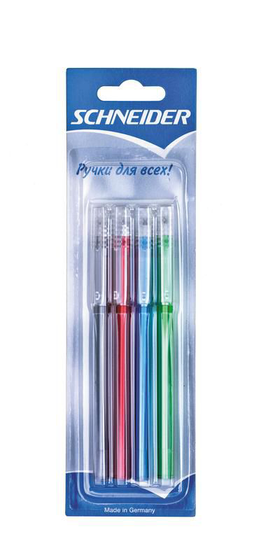Schneiders шариковая ручка с колпачком, 4 штуки. Цветной прозрачный корпус. Наконечник стержня изготовлен из износостойкой, нержавеющей стали. Цвет чернил: синий, черный, красный, зеленый.