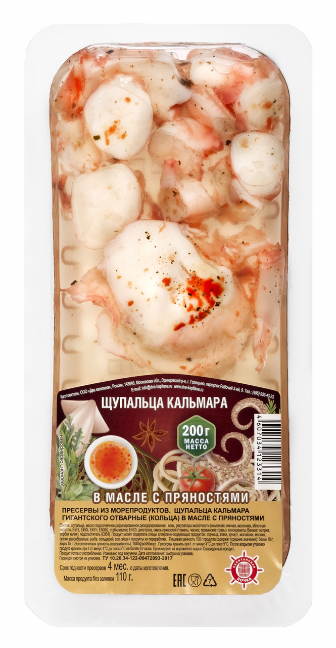 Щупальца кальмара гигантского кольца отварные DOSIDICUS GIGAS, масло подсолнечное рафинированное дезодорированное, соль пищевая, регуляторы кислотности лимонная, винная, молочная, яблочная кислоты, Е575, Е450, Е451, Е500ii, уксусная пищевая кислота, декстроза, смесь специй Бручетта II томаты, базилик, чеснок, усилители вкуса и аромата Е621, Е631, Е627, аромат базилика, загуститель Е410, консерванты бензоат натрия, сорбат калия, подсластитель Е954.