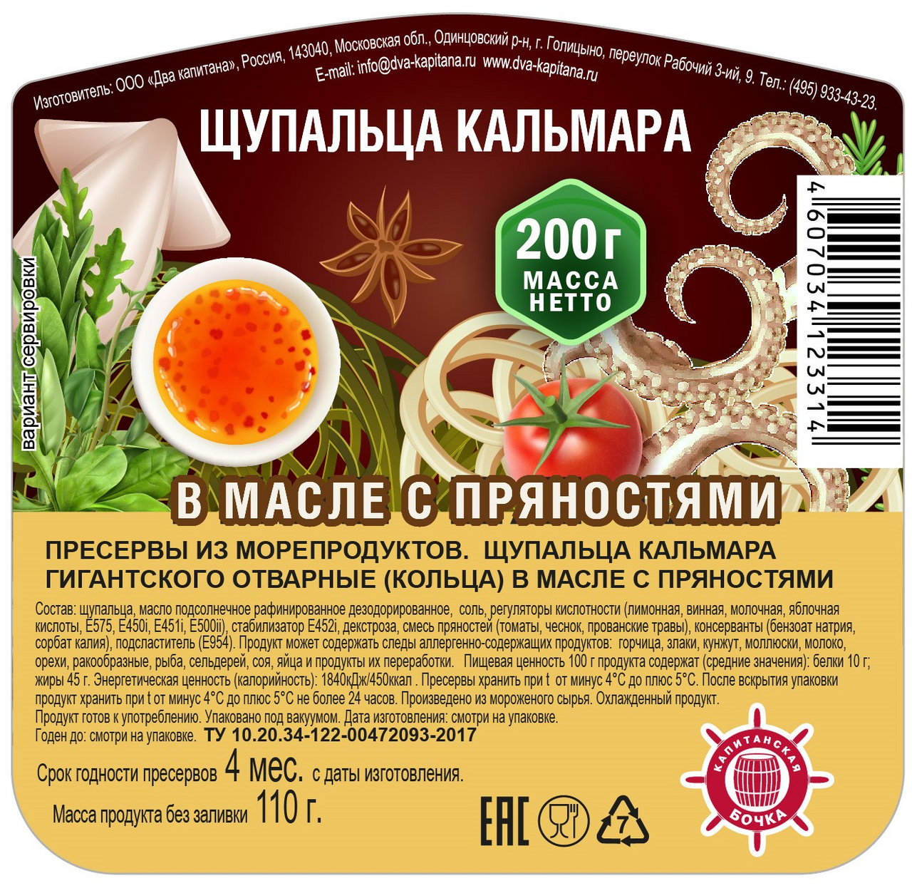 Щупальца кальмара Капитанская Бочка в масле с пряностями, 200г