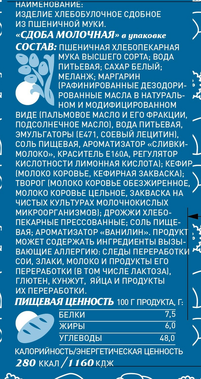 Пшеничная хлебопекарная мука высшего сорта; вода питьевая; сахар белый; меланж; маргарин рафинированные дезодорированные масла в натуральном и модифицированном видепальмовое масло и его фракции, подсолнечное масло вода питьевая, эмульгаторы Е471, соевый лецитин, соль пищевая, ароматизатор Сливки-молоко, краситель Е160a, регулятор кислотности лимонная кислота; кефир молоко коровье, кефирная закваска; дрожжи хлебопекарные прессованные; творог молоко коровье обезжиренное, молоко коровье цельное, закваска на чистых культурах молочнокислых микроорганизмов; улучшитель хлебопекарный пшеничная клейковина, эмульгатор Е472е, антиокислитель Е300, ферменты альфа-амилаза и гемицеллюлаза; соль пищевая; масло растительное дезодорированное; ароматизатор Ванилин.