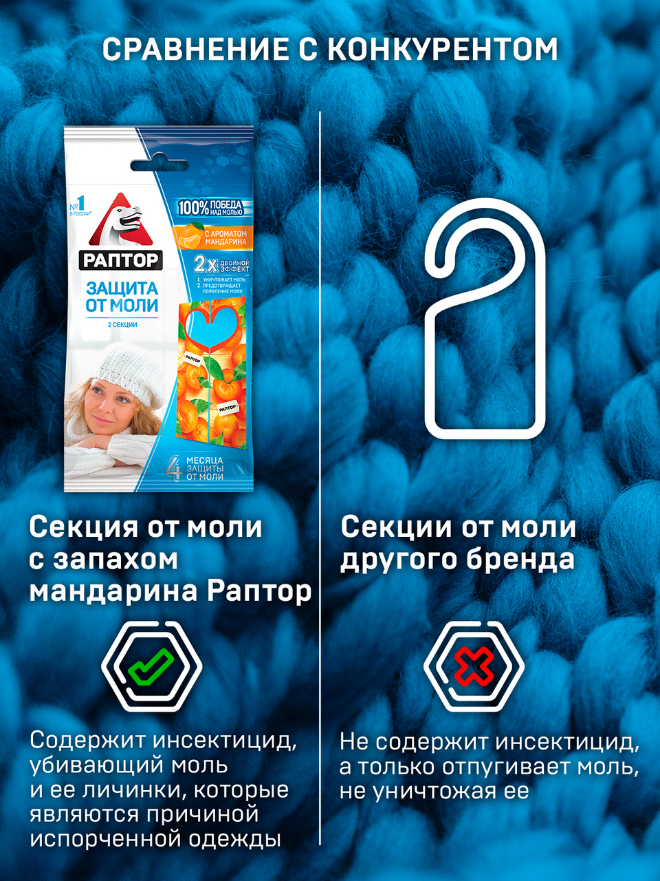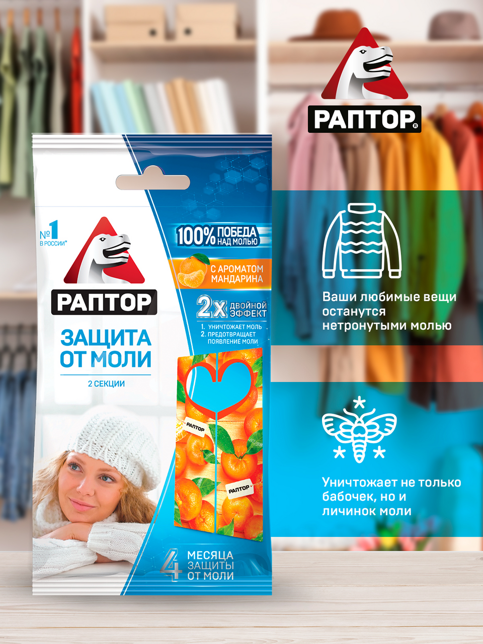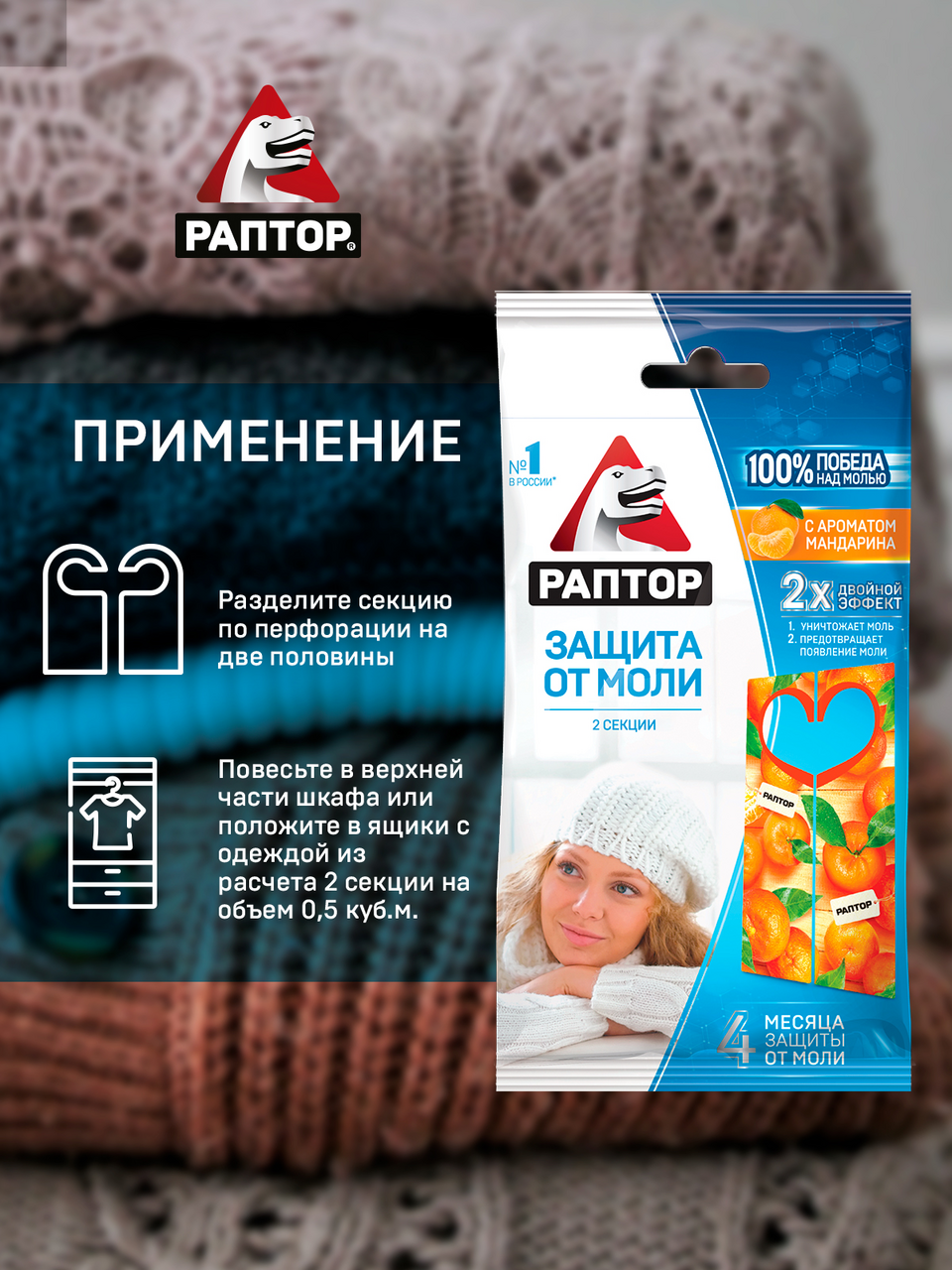 Секция Раптор от моли с запахом мандарина эффективно защищает от бабочек моли, ее личинок и кладки яиц. В состав формулы входит Transfluthrin (трансфлутрин) – современное быстродействующее вещество, эффективно уничтожит не только бабочек моли, но и ее личинки. Благодаря высокой летучести и проникающей способности трансфлутрин поражает насекомых в 10 раз быстрее, чем любой другой из известных пиретроидов. Инсектицид контактной и ингаляционной активности с быстрым действием против насекомых. Удобная форма изделия с пластиковой подвеской подходит для хранения меховых и шерстяных изделий, не оставляет пятен и следов на одежде, имеет приятный аромат мандарина и обеспечивает до 4-х месяцев эффективного действия.