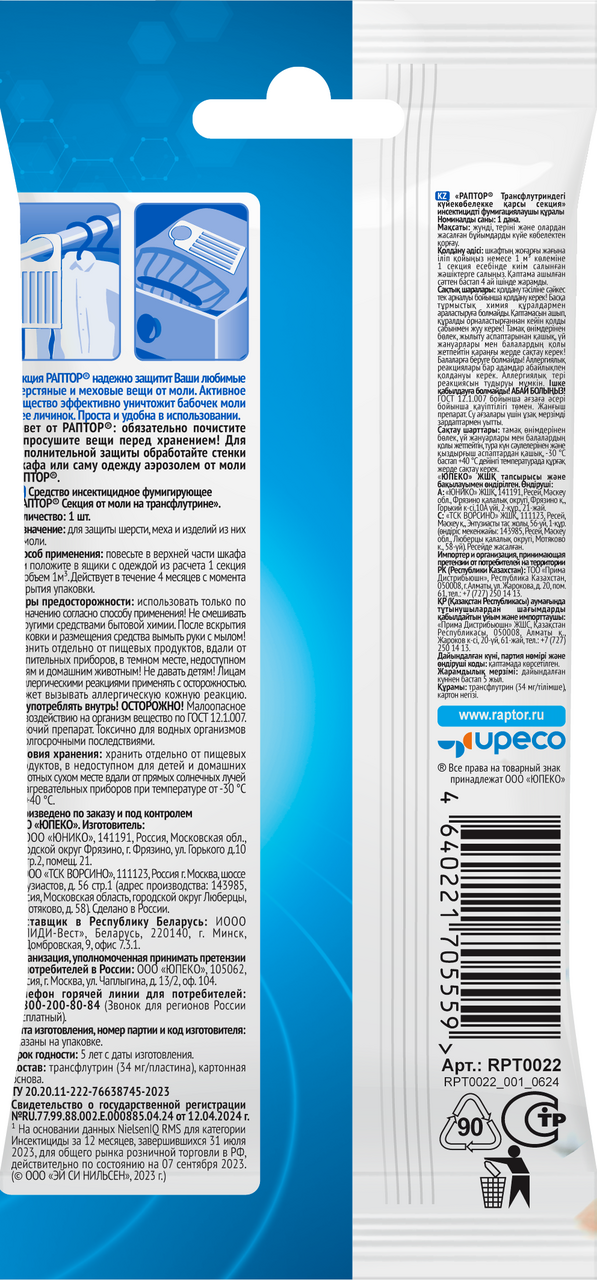 Секция Раптор надежно защитит Ваши любимые шерстяные и меховые вещи от моли. Активное вещество эффективно уничтожит бабочек моли и ее личинок. Проста и удобна в использовании.