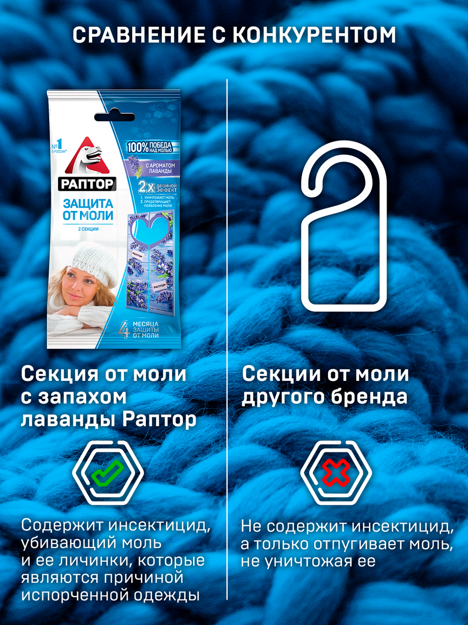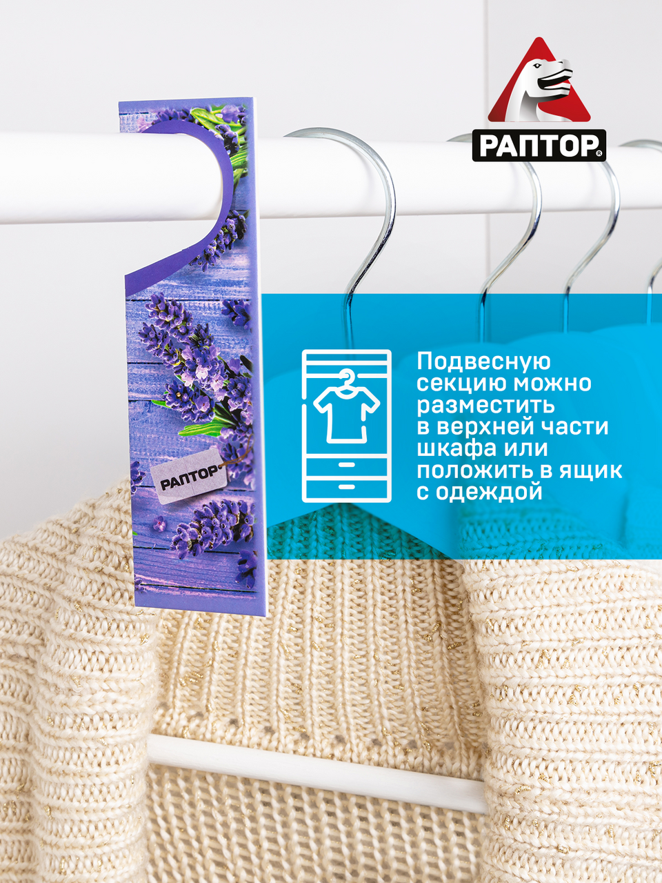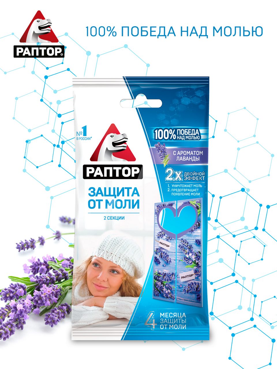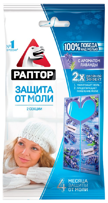 Гелевая секция Раптор не только защищает от появления моли, но и выступает в качестве ароматизатора для шкафа. Она имеет приятны лавандовый запах и не оставляет каких-либо следов на одежде. Средство отличается удобной и компактной формой, благодаря чему его без проблем можно разместить на дверце шкафа при помощи скотча. Срок полезной эксплуатации гелевой секции — 4 месяца. Двойной эффект от моли и ее личинок. Гель отпугивает моль, пластина уничтожает моль и ее личинки.