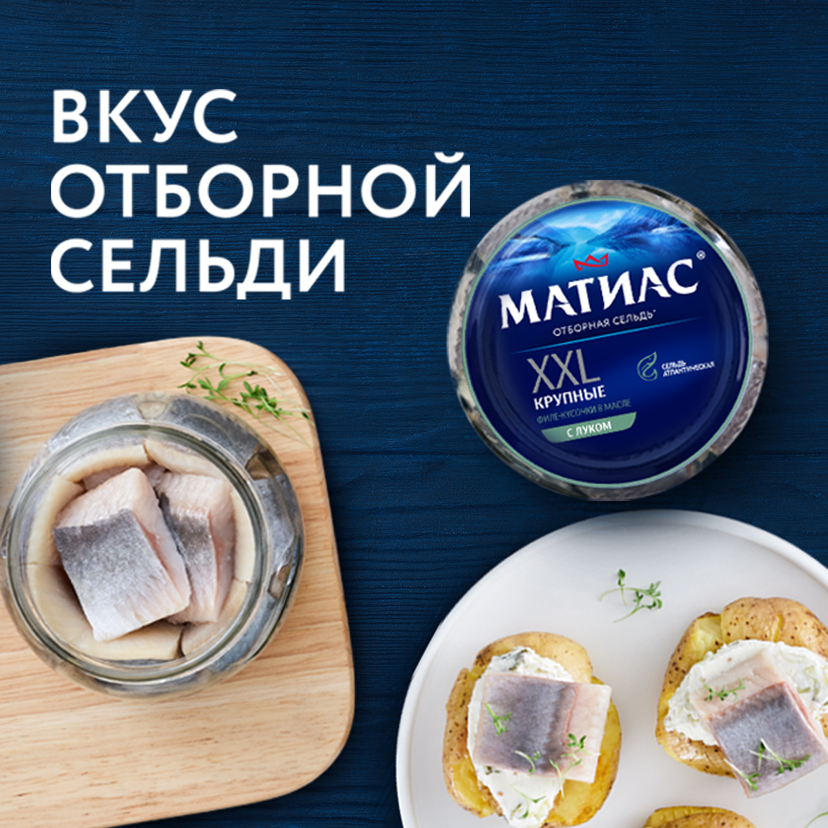 Матиас – это филе отборной сельди, выловленной в чистейших водах Атлантики в осенне-зимний период, когда рыба достигает максимальной жирности и приобретает поистине богатый и насыщенный вкус. Для производства сельди Матиас используется только филе определенного размерного ряда. Особая рецептура сельди Матиас без использования усилителей вкуса позволяет сохранить уникальный природный вкус рыбы. Особенность Сельди Матиас серии XXL - крупное отборное филе. Сельдь считается одной из самых жирных рыб, а белка в ней столько, что 250 граммов покрывают дневную потребность человека. Углеводов же, напротив, в сельди практически нет. По полезности атлантическая сельдь опережает некоторые деликатесные виды рыб, поскольку в ней содержится большое количество омега-3 жирных кислот.