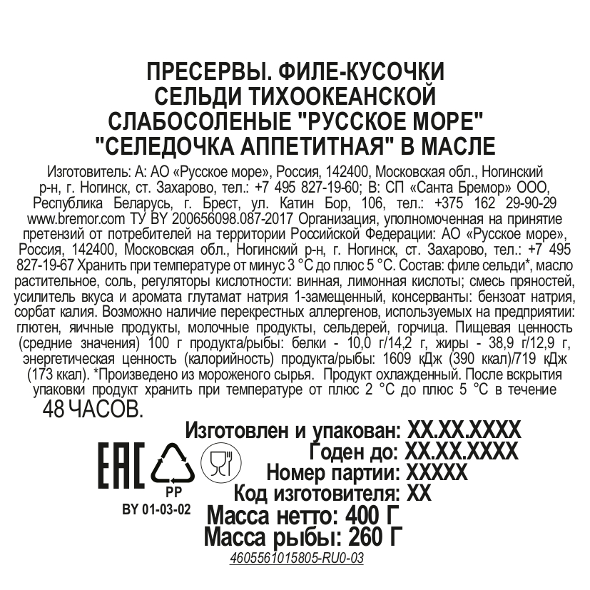 Селедочка Русское море — замечательный вариант для сытного и полезного перекуса. Сельдь уже нарезана на филе-кусочки, остается только выложить на хлеб. Особый посол сохраняет традиционный вкус рыбы и дарит наслаждение любимым продуктом! Необычный вкус привычной рыбы, в составе присутствуют смесь перцев (красный и зеленый) и чеснок, которые придают продукту изысканные пикантные нотки.
