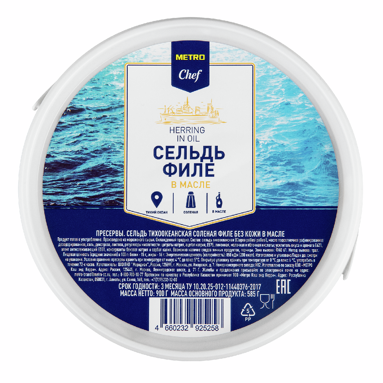 Сельдь Metro Chef филе в масле, 900 г – аппетитный рыбный деликатес, обладающий приятным вкусом. Это блюдо можно поставить на праздничный стол или предложить семье во время обычного обеда или ужина. Сельдь можно употреблять в качестве самостоятельной закуски, подавая в сочетании с отварным картофелем, использовать ее как ингредиент для салата или составляющую оригинальных канапе и бутербродов. Употребление этого рыбного блюда не только доставляет удовольствие, но и приносит пользу организму. В сельди содержатся незаменимые для здоровья жирные кислоты омега-3, белок, витамины группы В, D, селен, фосфор, йод, железо и другие микро- и макроэлементы. При включении в регулярный рацион это блюдо стимулирует аппетит, способствует выводу из организма плохого холестерина, нормализует обмен веществ, положительно влияет на работу органов сердечно-сосудистой системы, нормализует уровень гемоглобина в крови, улучшает работоспособность и мозговую деятельность, укрепляет иммунитет.