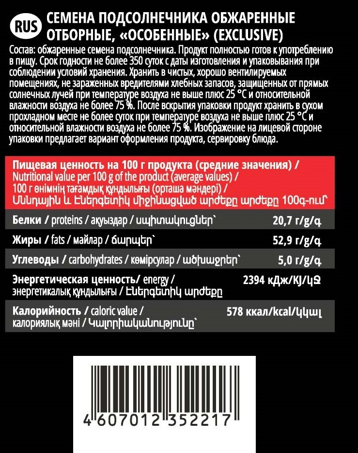 Семечки особенные От Мартина 200 г – вкусный продукт, которые очень популярен как среди взрослых, так и среди детей. С ним можно скрасить свой досуг или отвлечься во время рабочего перерыва. В семенах подсолнечника содержится большой спектр веществ, необходимых организму человека. Это не только белки, жиры и углеводы, но и различные витамины. Среди них есть такие, как А (важен для зрения), B (полезен для кожи, волос, нервной системы), E (сильный антиоксидант) и некоторые другие. Также в семенах подсолнечника содержатся магний, кальций, калий, цинк, селен и ряд других макро- и микроэлементов. Незаменимые аминокислоты нормализуют жировой обмена, а ненасыщенные жирные кислоты положительно влияют на работы кровеносной и сердечно-сосудистой систем. Продукт поставляется в практичной и герметичной упаковке, которая надежно защищает содержимое от внешнего воздействия. Компания Мартин, которая является производителем данной продукции, была основана в 2000 году в Московской области. За все годы своего существования она вложила немало сил в улучшении селекции, технологии обжарки и создании необходимых условий для хранения готовой продукции. Благодаря этому компания предлагает потребителям отборные семечки, которые известны не только в РФ, но и некоторых других странах. Сегодня Мартин предлагает свыше ста наименований продукции, для изготовления которой используются только экологичные компоненты. Высокие результаты работы компании были неоднократно отмечены различными наградами. В частности, высокое качество продукции было подтверждено призами на таких международных выставках, как Зеленая неделя, Продэкспо, WorldFood и ArmProd Expo.