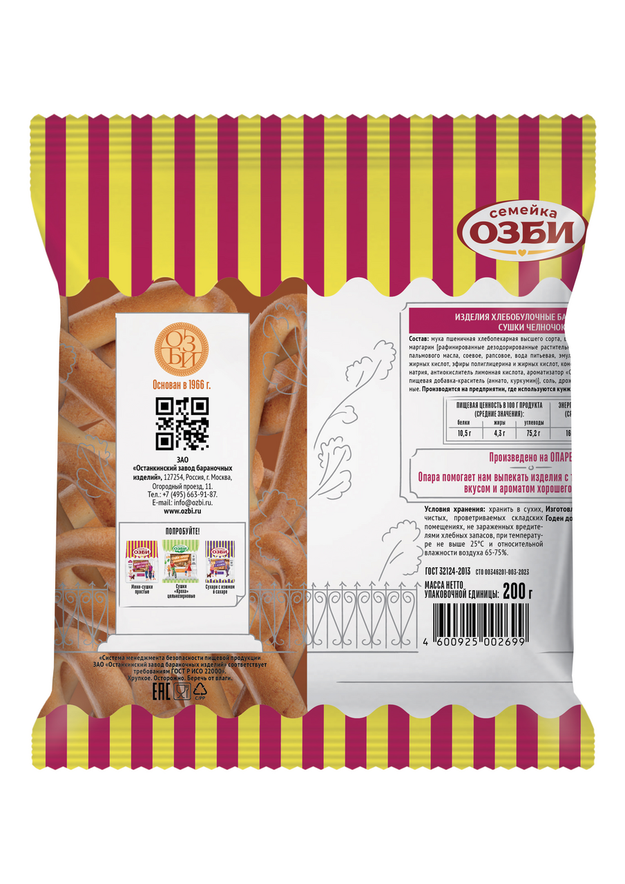 Любимые с детства сушки челночок — румяные, хрустящие, ароматные! Прекрасное угощение к чаю и простой перекус, который удобно взять с собой на работу или в школу. Останкинский завод бараночных изделий — единственный в России завод, который специализируется исключительно на производстве сушек и баранок. Сушки Семейка Озби готовятся классическим способом с использованием опары. Натуральный состав позволяет рекомендовать сушки как перекус даже тем, кто выбирает здоровое питание! Натуральный продукт без консервантов.