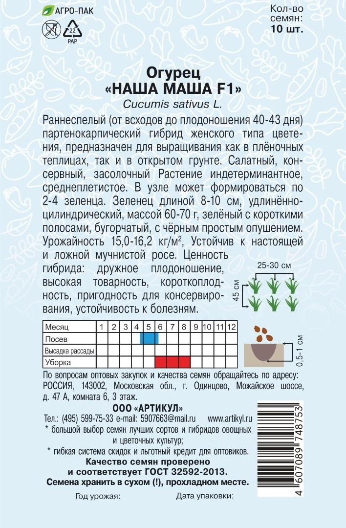 Раннеспелый (от всходов до плодоношения 40-43 дня) партенокарпический гибрид женского типа цветения, предназначен для выращивания как в пленочных теплицах, так и в открытом грунте. Салатный, консервный, засолочный Растение индетерминантное, среднеплетистое. В узле может формироваться по 2-4 зеленца. Зеленец длиной 8-10 см, удлиненно-цилиндрический, массой 60-70 г, зеленый с короткими полосами, бугорчатый, с черным простым опушением. Урожайность 15,0-16,2 кг/кв.м, Устойчив к настоящей и ложной мучнистой росе. Ценность гибрида: дружное плодоношение, высокая товарность, короткоплодность, пригодность для консервирования, устойчивость к болезням. + Огурцы улучшают аппетит, способствуют усвоению пищи и выводу шлаков из организма.