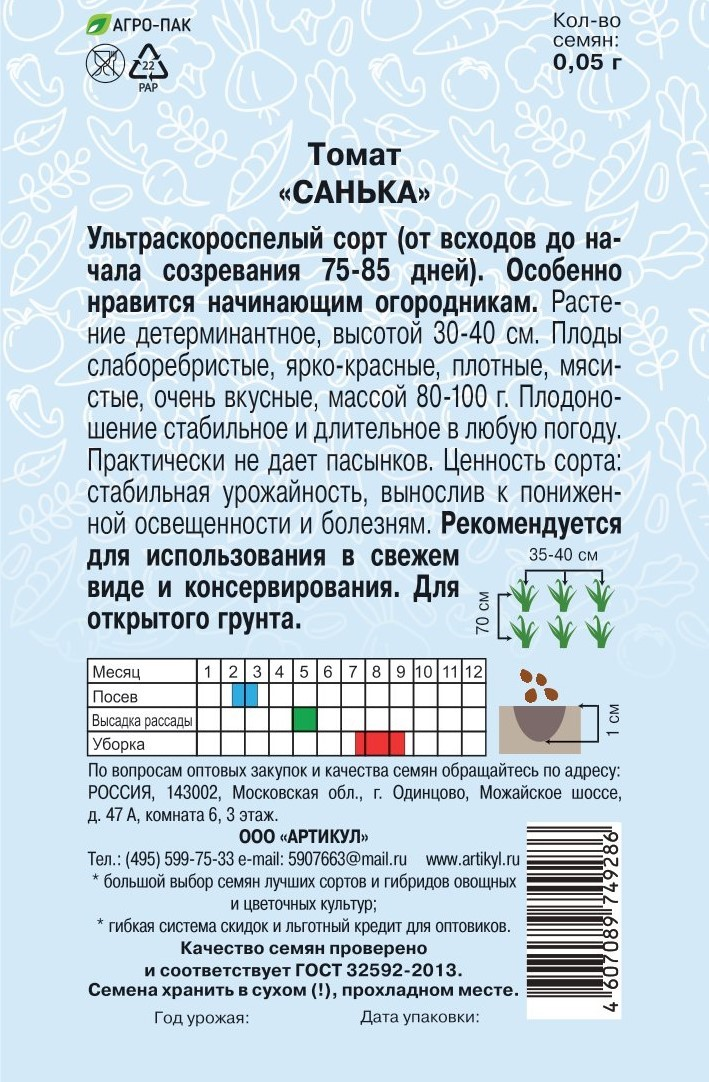 Семена Артикул Томат Санька, 2г