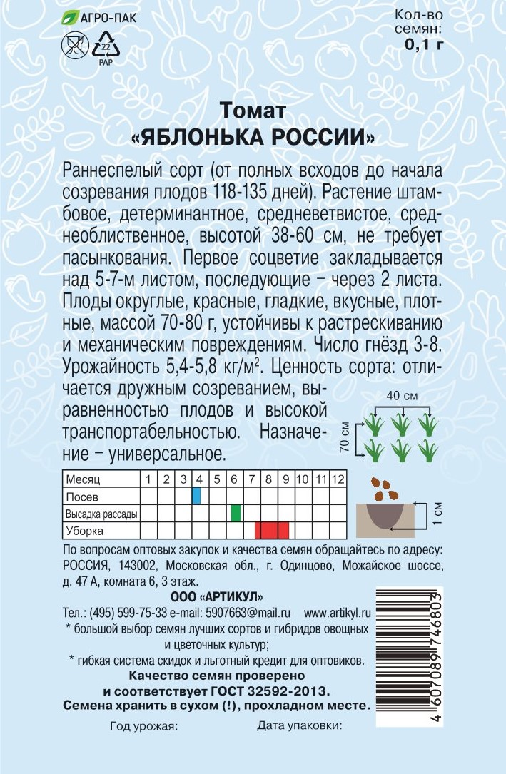 Семена Артикул Томат Яблонька России, 2г