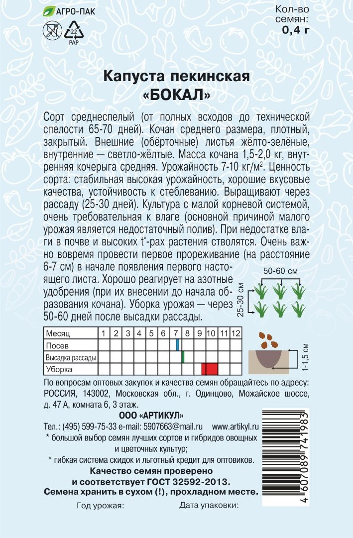 Сорт среднеспелый (от полных всходов до технической спелости 65-70 дней). Кочан среднего размера, плотный, закрытый. Внешние (обёрточные) листья жёлто-зелёные, внутренние - светло-жёлтые. Масса кочана 1,5-2,0 кг, внутренняя кочерыга средняя. Урожайность 7-10 кг/м2. Ценность сорта: стабильная высокая урожайность, хорошие вкусовые качества, устойчивость к стеблеванию. Используют в свежем виде в салатах, в варёном виде в супах, а также в тушёном и квашеном виде. Выращивают через рассаду (25-30 дней). Культура с малой корневой системой, очень требовательная к влаге (основной причиной малого урожая является недостаточный полив). При недостатке влаги в почве и высоких t-рах растения стволятся. Очень важно вовремя провести первое прореживание (на расстояние 6-7 см) в начале появления первого настоящего листа. Хорошо реагирует на азотные удобрения (при их внесении до начала образования кочана). Уборка урожая - через 50-60 дней после высадки рассады. + Содержит ферменты, углеводы, пектиновые и азотистые вещества, особенно богата витаминами А, В1, В2, РР, С, солями кальция, железа, калия, которые находятся в легкодоступной форме.