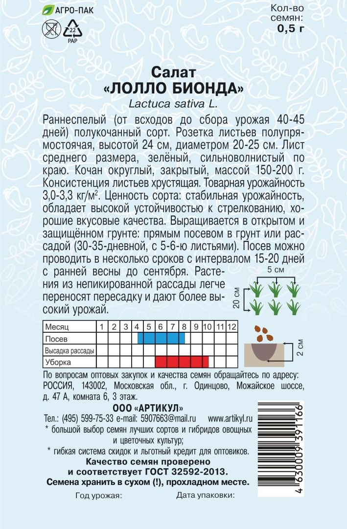Среднеранний (от всходов до сбора – 53-55 дней) сорт листового типа. Листья нежные, гофрированные, интенсивно красно-розовые, без горечи, сочные, хрустящие, отличного вкуса. Розетка листьев диаметром 18-20 см, массой 200-250 г. Сорт подходит как для открытого, так и для защищённого грунта, устойчив к стрелкованию (цветушности). Посев проводят с апреля до августа, через каждые 2-3 недели.