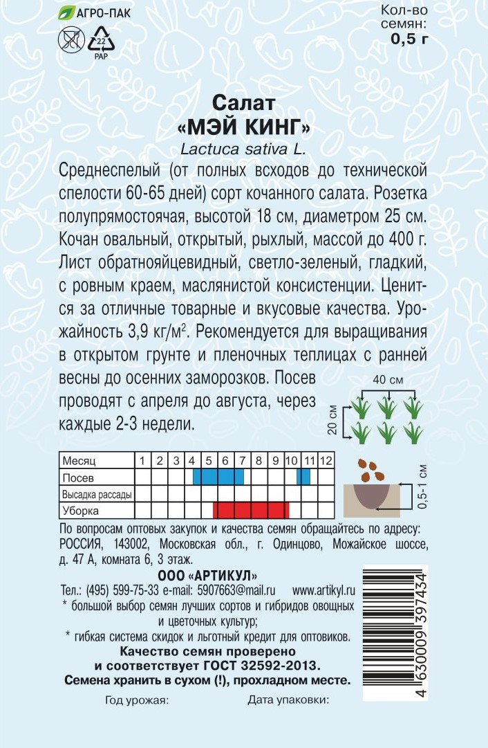 Среднеспелый (от полных всходов до технической спелости 60-65 дней) сорт кочанного салата . Розетка полупрямостоячая, высотой 18 см, диаметром 25 см. Кочан овальный, открытый, рыхлый, массой до 400 г. Лист обратнояйцевидный, светло-зеленый, гладкий, с ровным краем, маслянистой консистенции. Ценится за отличные товарные и вкусовые качества. Урожайность 3,9 кг/м2. Рекомендуется для выращивания в открытом грунте и пленочных теплицах с ранней весны до осенних заморозков. Посев проводят с апреля до августа, через каждые 2-3 недели.