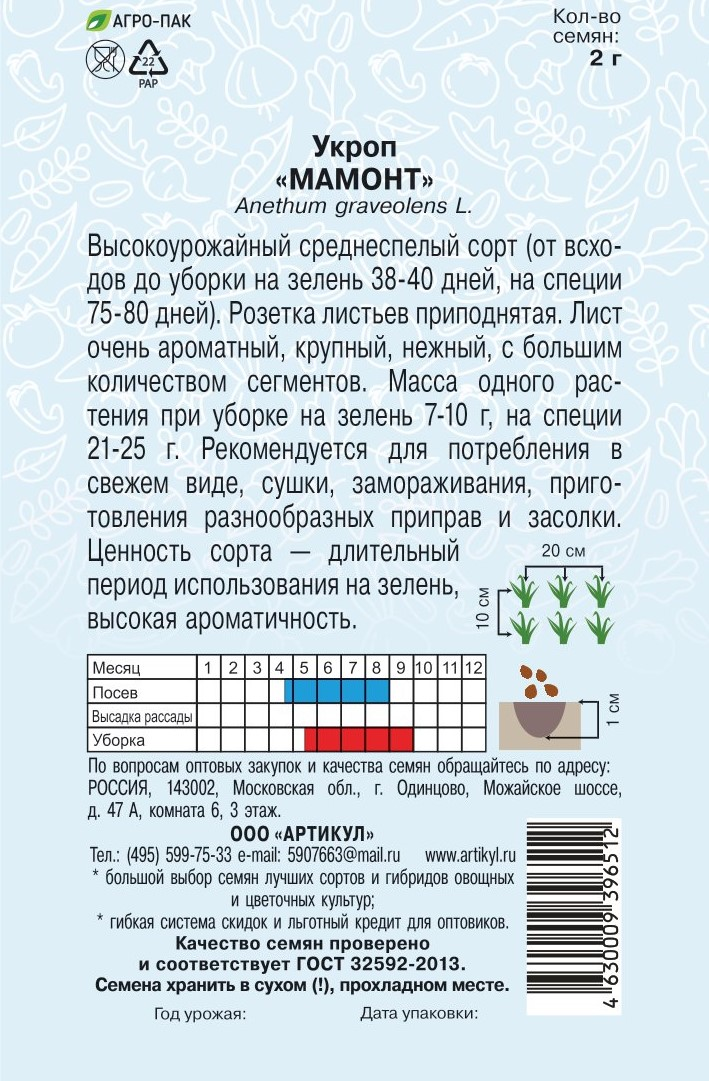Семена Артикул Укроп Мамонт, 1г