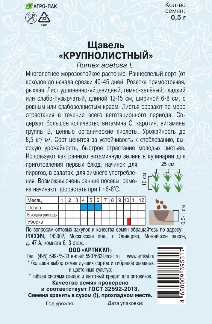 Раннеспелый (18-37 дней от появления всходов до технической спелости листьев). Листья нежные, овально-удлиненной формы, светло-зеленого цвета, гладкие. Урожайность за два сбора 5-6 кг/м. Отличается высоким содержанием витаминов и морозоустойчивостью. Устойчив к стеблеванию.