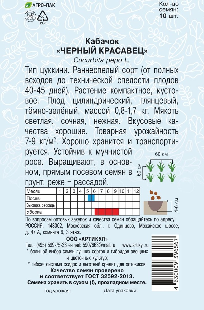 Тип цуккини. Раннеспелый сорт (от полных всходов до технической спелости плодов 40-45 дней). Растение компактное, кустовое. Плод цилиндрический, глянцевый, темно-зеленый, массой 0,8-1,7 кг. Мякоть светлая, сочная, нежная. Вкусовые качества хорошие. Товарная урожайность 7-9 кг/м2. Хорошо хранится и транспортируется. Устойчив к мучнистой росе. Выращивают, в основном, прямым посевом семян в грунт, реже - рассадой. В мякоти кабачка много легкоусвояемых углеводов, витаминов В1, В2, С, РР, Е, Н. Идеален для диетического питания.