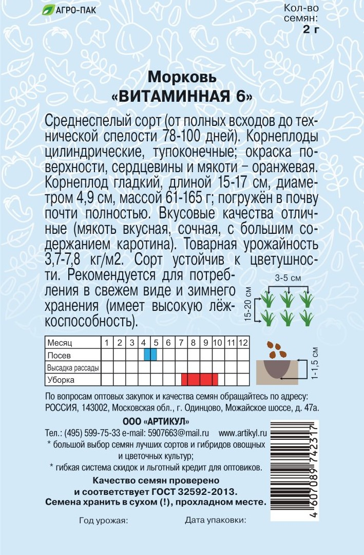 Среднеспелый сорт (от всходов до технической спелости 78-100 дней). Форма корнеплода цилиндрическая, тупоконечная; окраска поверхности, сердцевины и мякоти - оранжевая. Поверхность корнеплода гладкая, длина 15 см, диаметр 4,9 см. Корнеплод погружён в почву почти полностью. Масса корнеплода 61-165 г. Вкусовые качества отличные (вкусный, сочный. с большим содержанием каротина). Товарная урожайность 3,7-7,8 кг/м2. Сорт устойчив к цветушности, имеет высокую лёжкоспособность. Рекомендуется для потребления в свежем виде и зимнего хранения. + Содержит каротин, витамины В1, В2, Р. Морковный сок является лечебным средством.