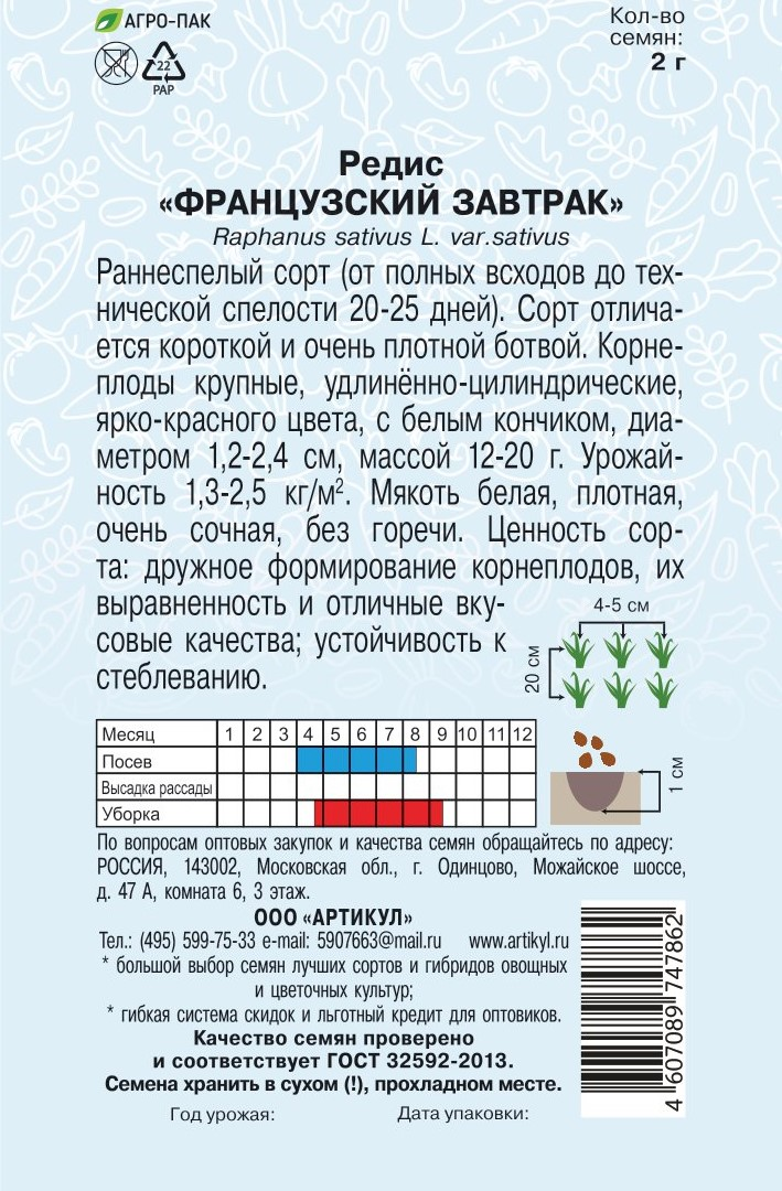 Раннеспелый сорт (от полных всходов до технической спелости 20-25 дней). Сорт отличается короткой и очень плотной ботвой. Корнеплоды крупные, удлинённо-цилиндрические, ярко-красного цвета, с белым кончиком, диаметром 1,2-2,4 см, массой 12-20 г. Урожайность 1,3-2,5 кг/м2. Мякоть белая, плотная, очень сочная, без горечи. Ценность сорта: дружное формирование корнеплодов, их выравненность и отличные вкусовые качества; устойчивость к стеблеванию. + Редис содержит витамины, минеральные соли и ферменты, способствующие улучшению пищеварения.