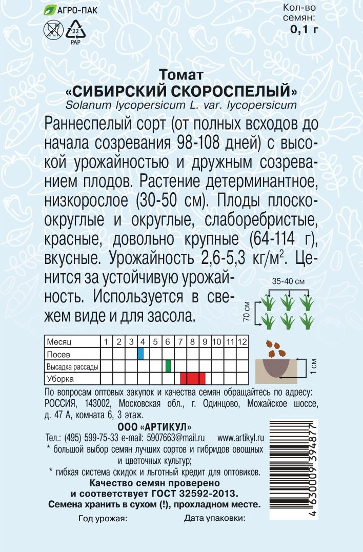 Семена Артикул Томат Сибирский скороспелый 10г
