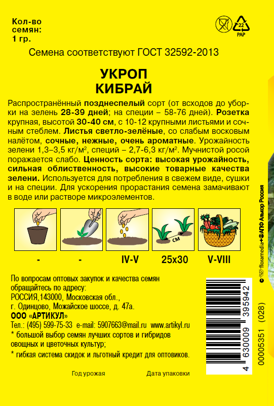 Семена Артикул Дисплей 36 эконом укроп кибрай